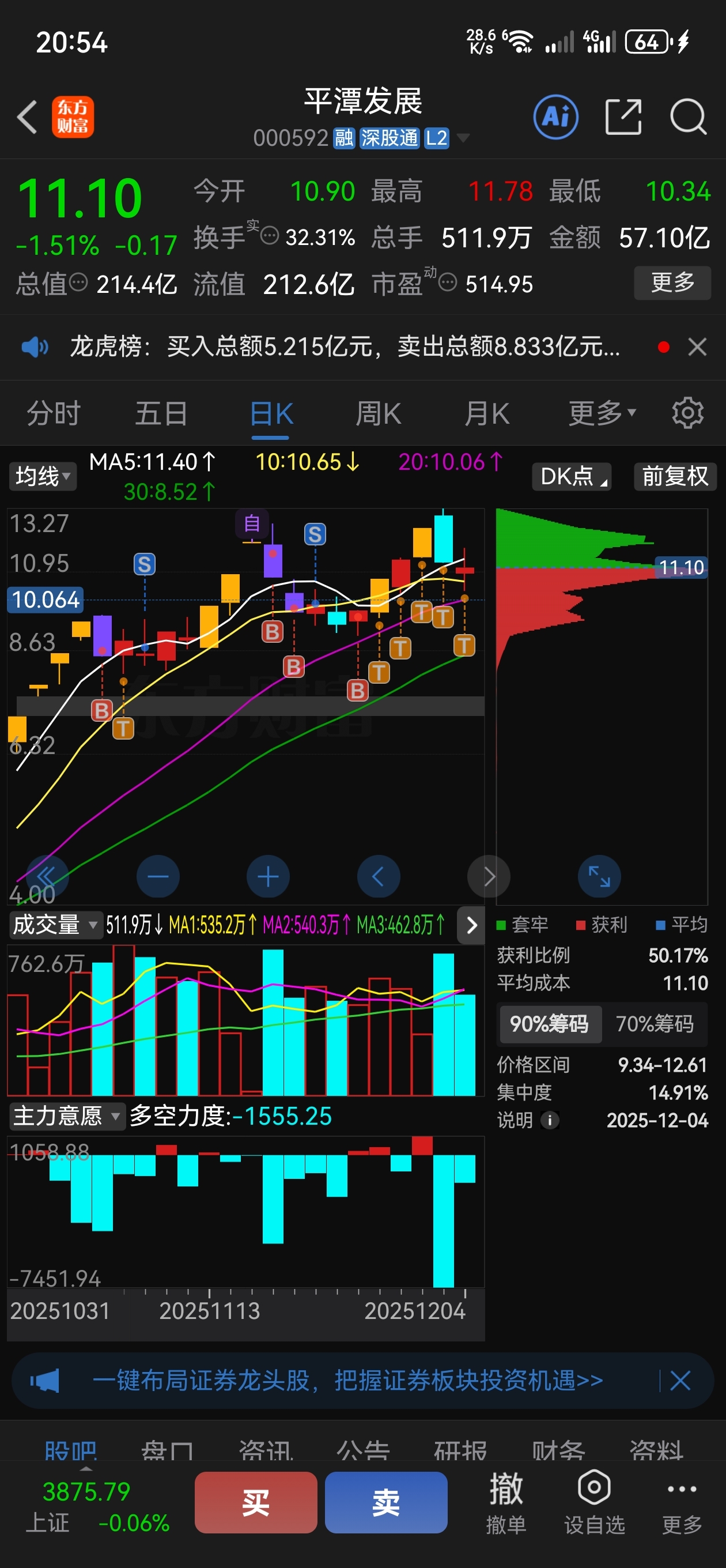 $平潭发展(SZ000592)$ 不容易啊,成本从11.5T到10.06,收盘破10日先就走一点。