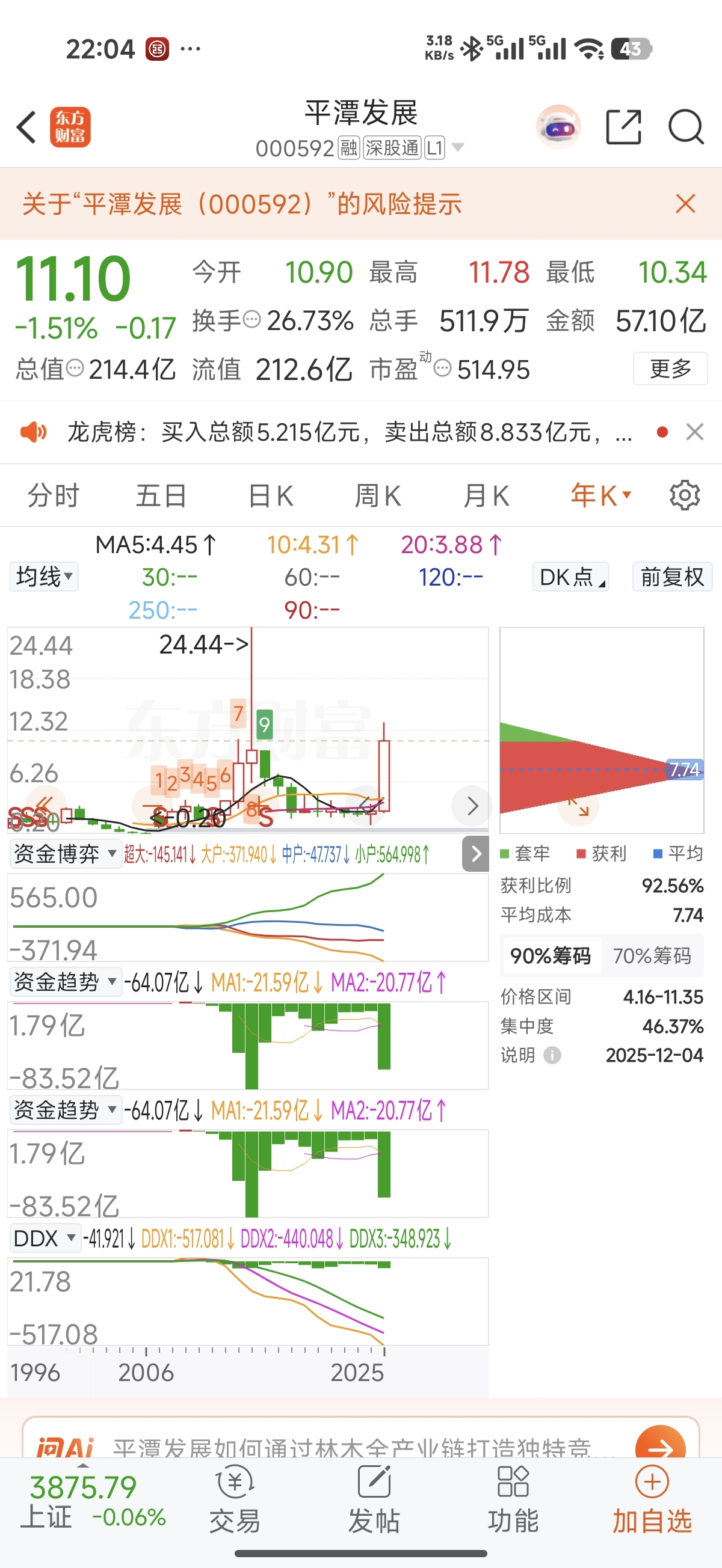 大牛股平潭发展是进场还是离场?筹码峰告诉你答案!长线成本在8块附近,中线成本在1