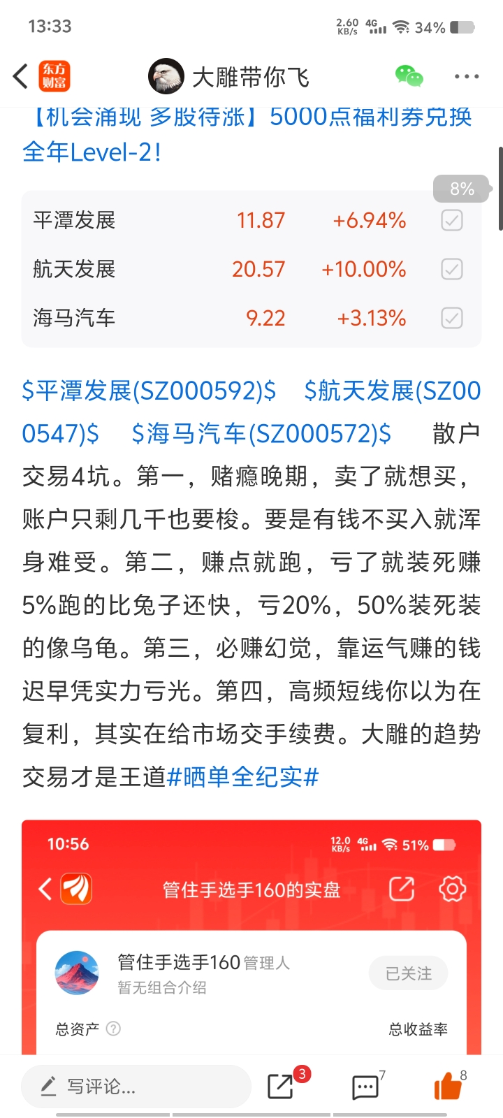 $平潭发展(SZ000592)$ $航天发展(SZ000547)$ $实达集团(SH600734)$ 所有人都在教你们追涨杀跌,却没人告诉你这背后无数亏损者的沉没。如果追涨杀跌能赚到钱,你连门都不知道在哪里,趋势波段才是散户能赚钱的唯一法门!大雕见过太多亏损累累的散户了,别自大别固执!要认清自己,认清现实,如果你持续亏损,该想想了