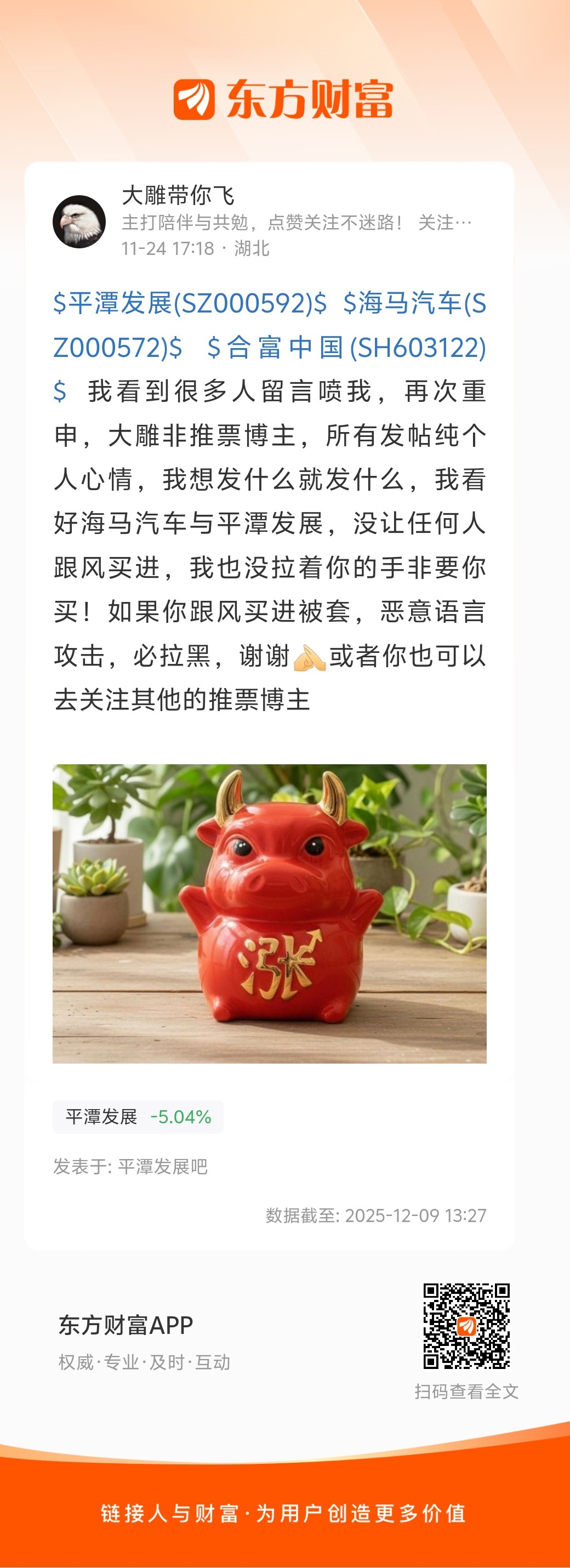 $平潭发展(SZ000592)$ $海马汽车(SZ000572)$ $龙洲股份(SZ002682)$ 我在11月24继续看好跨年龙平潭发展时候,很多人跟风买进,实际上很多人小散户吃个跌停就跑了,不光跑,还留言喷我。而大雕的粉丝天天做t持有到现在,个个都赚钱。在平潭发展都亏钱的人,我认识一个工业富联的主管,我介绍你去打螺丝可好?毕竟你在龙头股都赚不到钱,你压根就不可能在股市赚到钱!韭菜永远都只是一颗韭菜