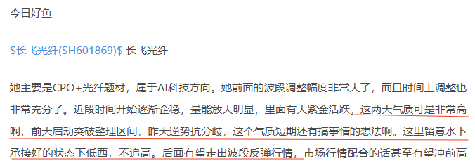 她主要是空芯光纤+CPO题材,公司实力行业领先,公司的快贝空芯光纤拥有自主知识产权以及全球领先的性能指标。上周五早文潮汐哥分析了她,当时讲了她有望走出波段反弹行情。分析还是比较及时的啊,周五果然走高的阳线,如期有鱼获。接下来的想法,因为基本面非常稀缺,那么锚定五均线上方跟踪波段反弹行情,不破就问题不大,适当多些耐心,后面甚至她还有望冲前高啊。