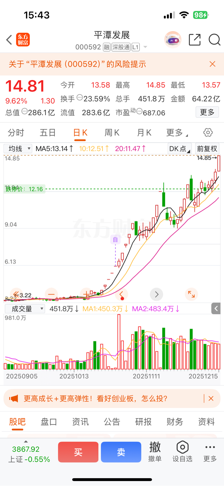 $平潭发展(SZ000592)$ 早期刚开始,想着回调杀进去,哎
