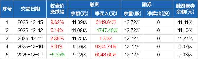 融资方面,当日融资买入4.73亿元,融资偿还4.41亿元,融资净买入3149.61万元。融券方面,融券卖出0股,融券偿还0股,融券余量12.72万股,融券余额188.38万元。融资融券余额合计11.41亿元。