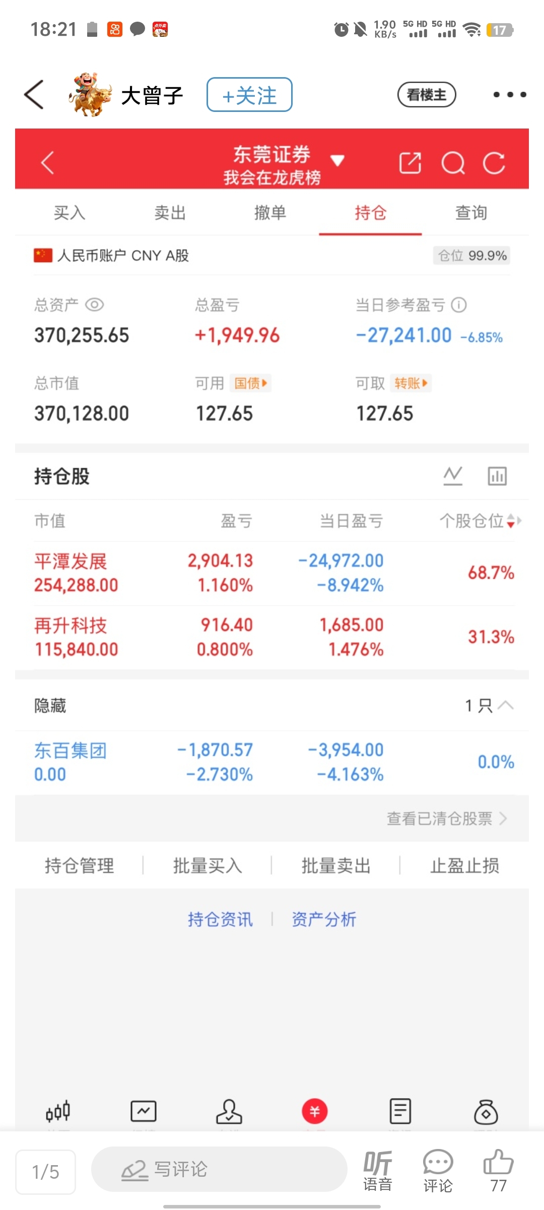 $平潭发展(SZ000592)$ 顶级游资大曾子,陈小群是弟弟,炒股养家也不过如此,今天加仓平潭看好二波,买入$再升科技(SH603601)$ 锁仓看好反包,卖出$东百集团(SH600693)$