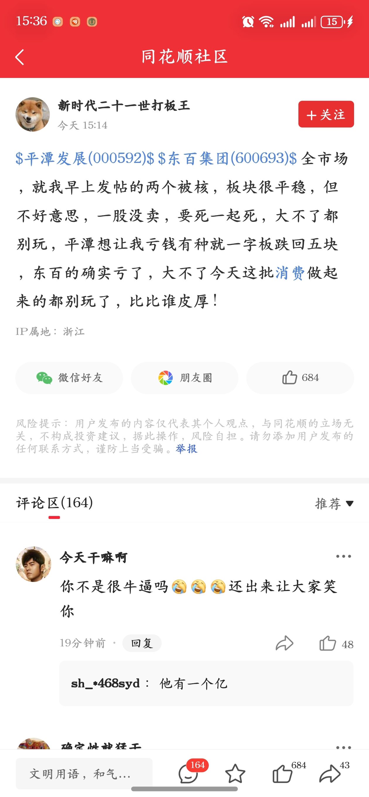 神仙打架,小散遭殃。共勉这大哥确实太高调了…挣钱就挣钱呗还要发个跌停求虐…害死了