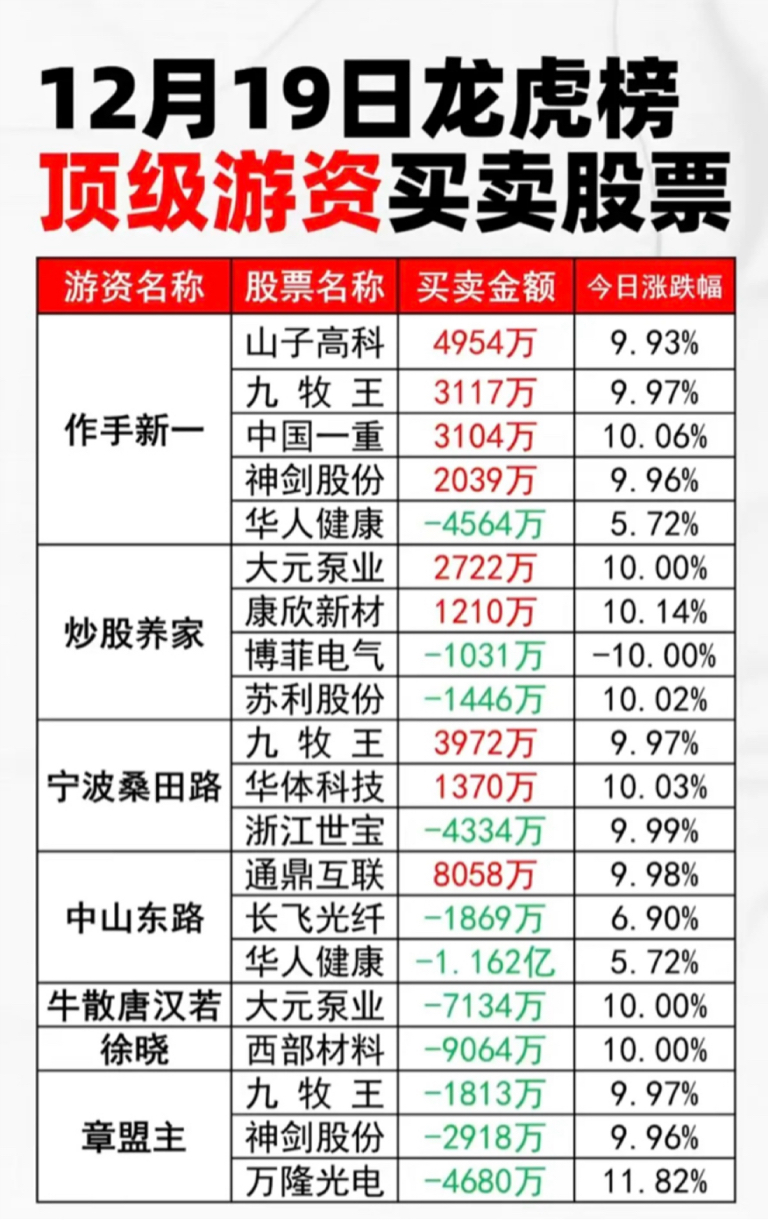 12月19日(周五)龙虎榜:成交活跃 顶级游资动向一览