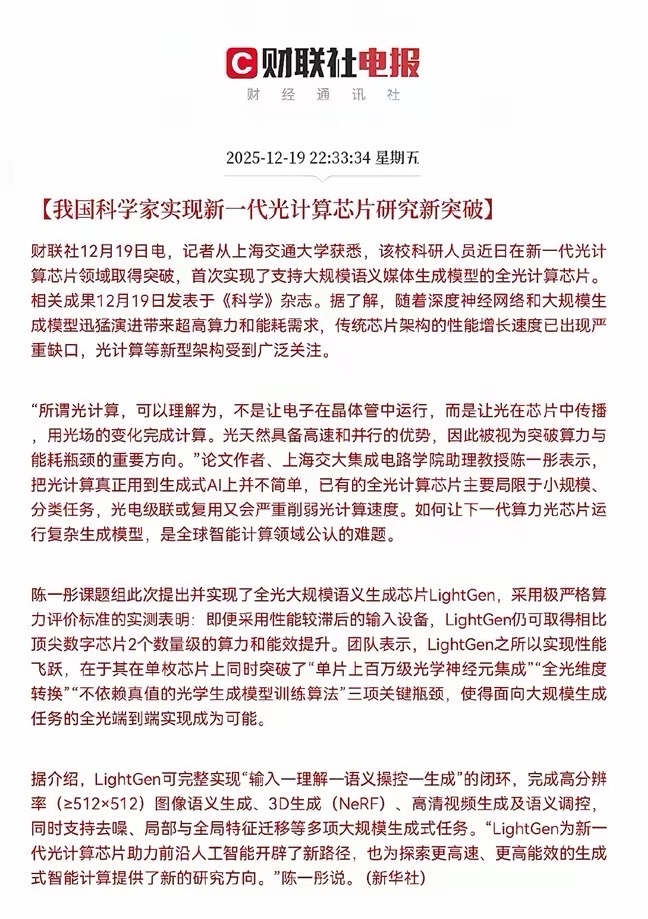 我国科学家攻克技术瓶颈,成功研发出全光大模型语义生成芯片LightGen,实现新一代光计算芯片领域的关键突破。