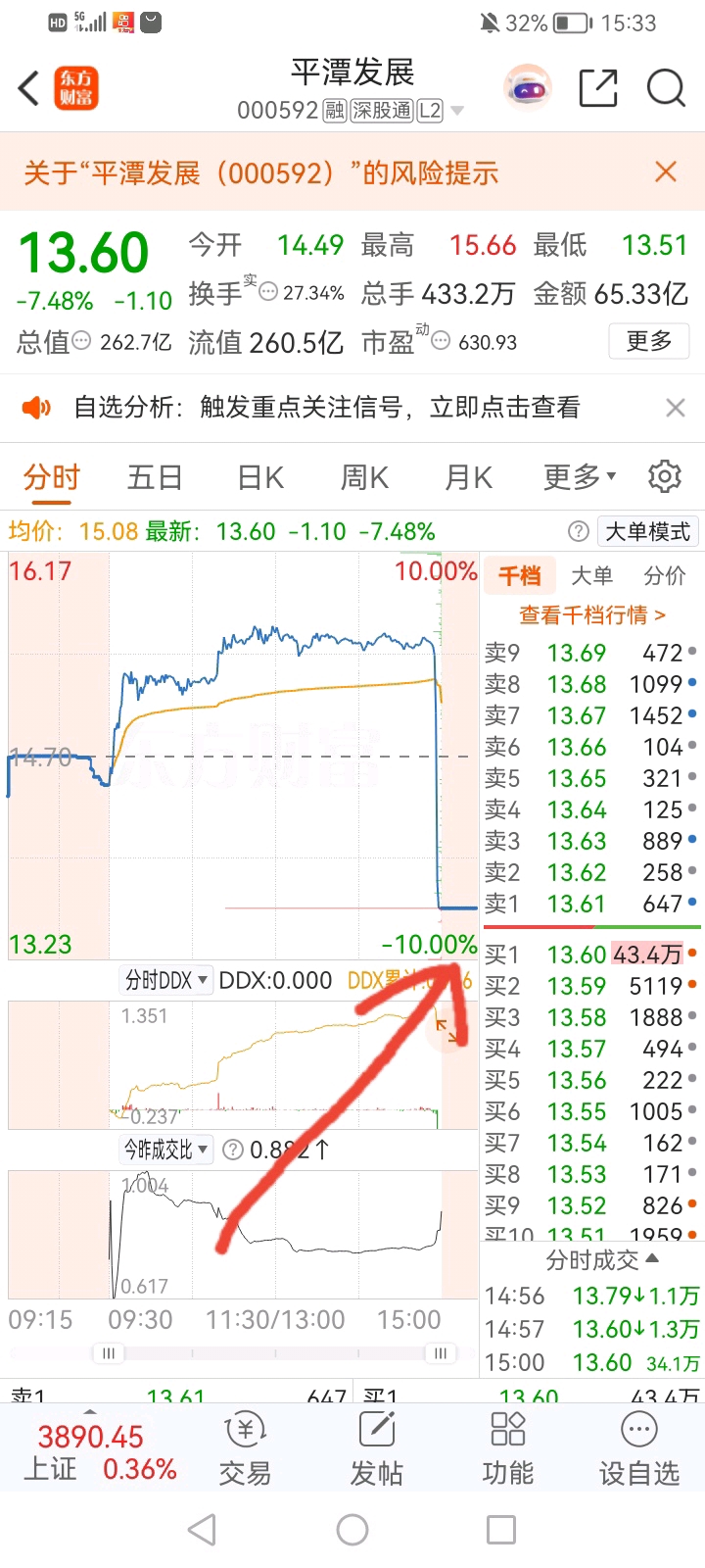 $平潭发展(SZ000592)$ $东百集团(SH600693)$ 东百集团砸盘毫无承接周一危险了!为啥主力要尾盘集合竞价砸盘?因为盘中砸盘会有大量散户撤掉买单抢跑,集合竞价砸盘出货散户不能撤单!而平潭发展周五砸盘时买1档有43.4万手的买单托底,还是有大资金承接,不然早都被砸到跌停板了!就看这43.4万手买单周一会不会做多! 平潭有强修复预期!