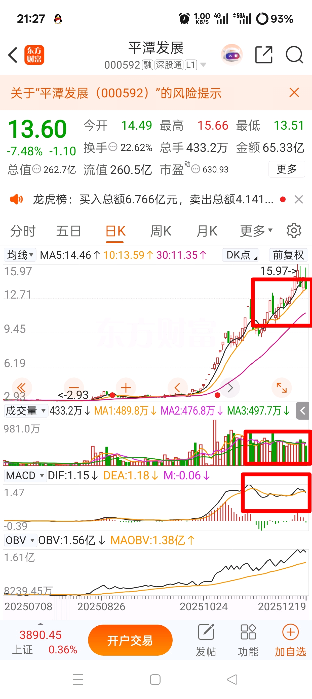 $平潭发展(SZ000592)$ 从技术上来看,这一段的上涨相比于上一段上涨并没有放出量能,属于动能不足也就是顶背离,迟早会有这一跌。而量能也是情绪的一种表现