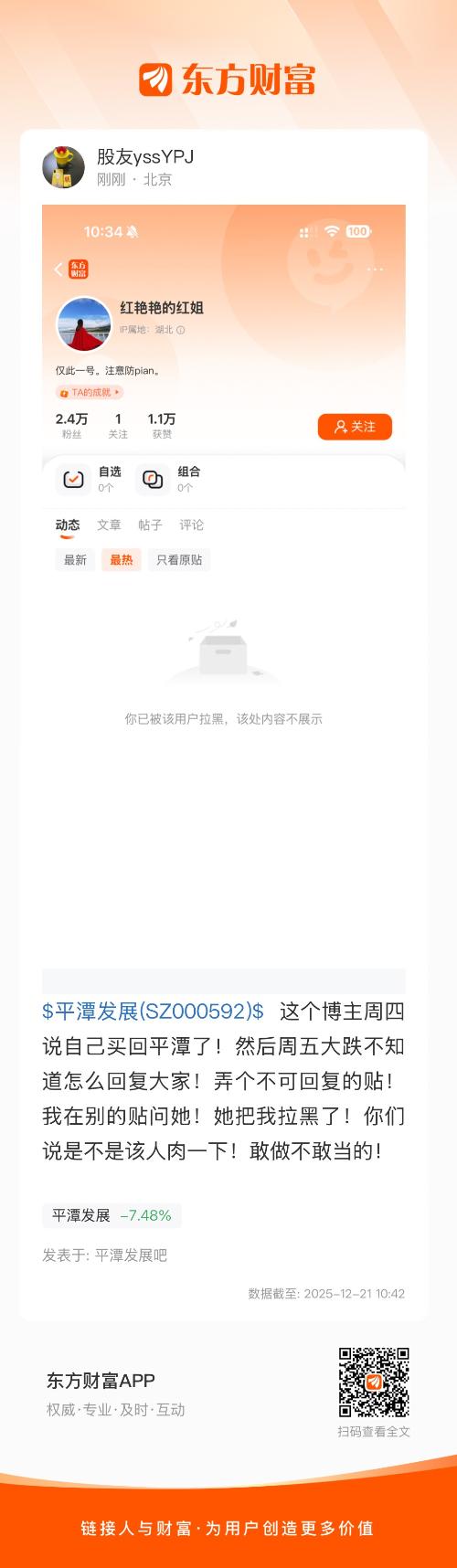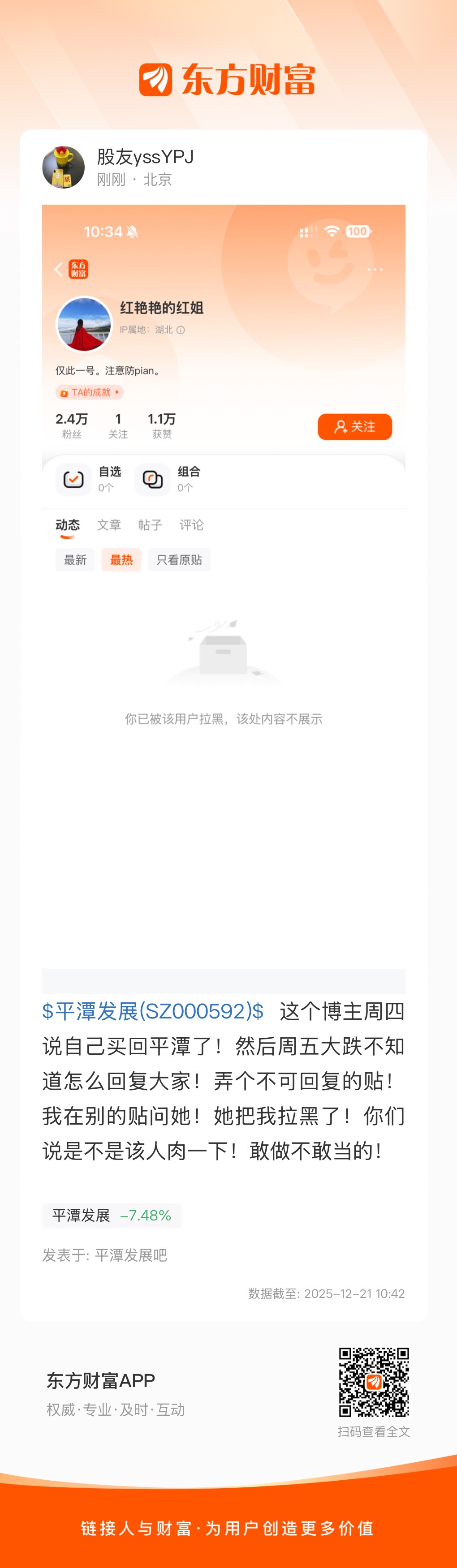 $平潭发展(SZ000592)$ 这个博主周四说自己买回平潭了!然后周五大跌不知道怎么回复大家!弄个不可回复的贴!我在别的贴问她!她把我拉黑了!你们说是不是该人肉一下!敢做不敢当的!