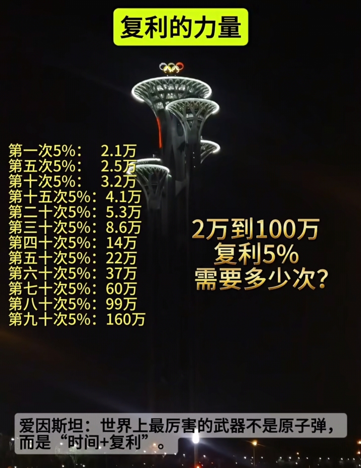 $平潭发展(SZ000592)$ $航天发展(SZ000547)$ $永辉超市(SH601933)$ 如果你有2万,每个月5%,那么你就可以体会到复利的力量。追涨杀跌?亏的没边#社区牛人计划# #盘逻辑:深度解析,理清投资思路#