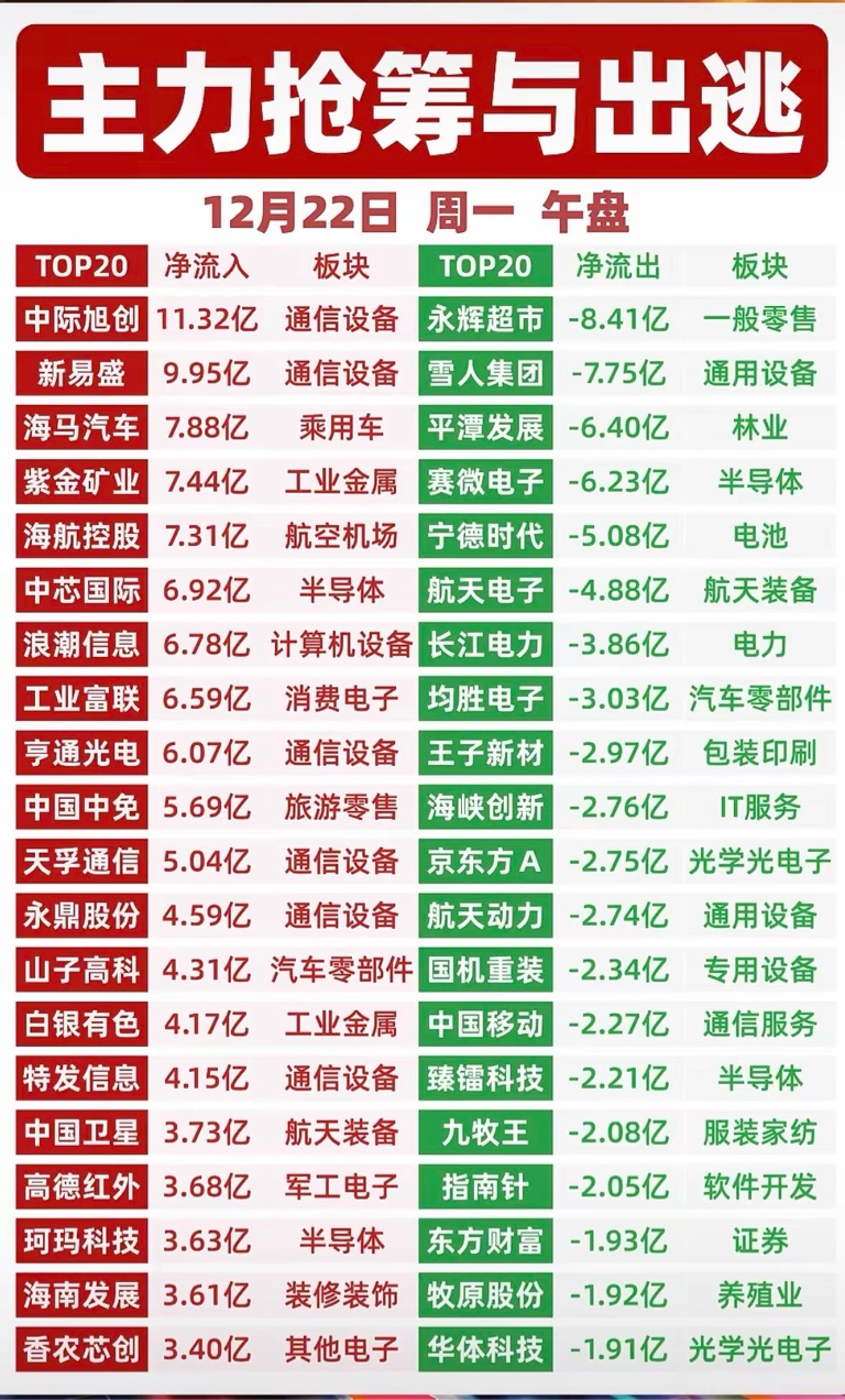 12月22日主力资金板块动向分析——净流入/流出TOP20榜单
