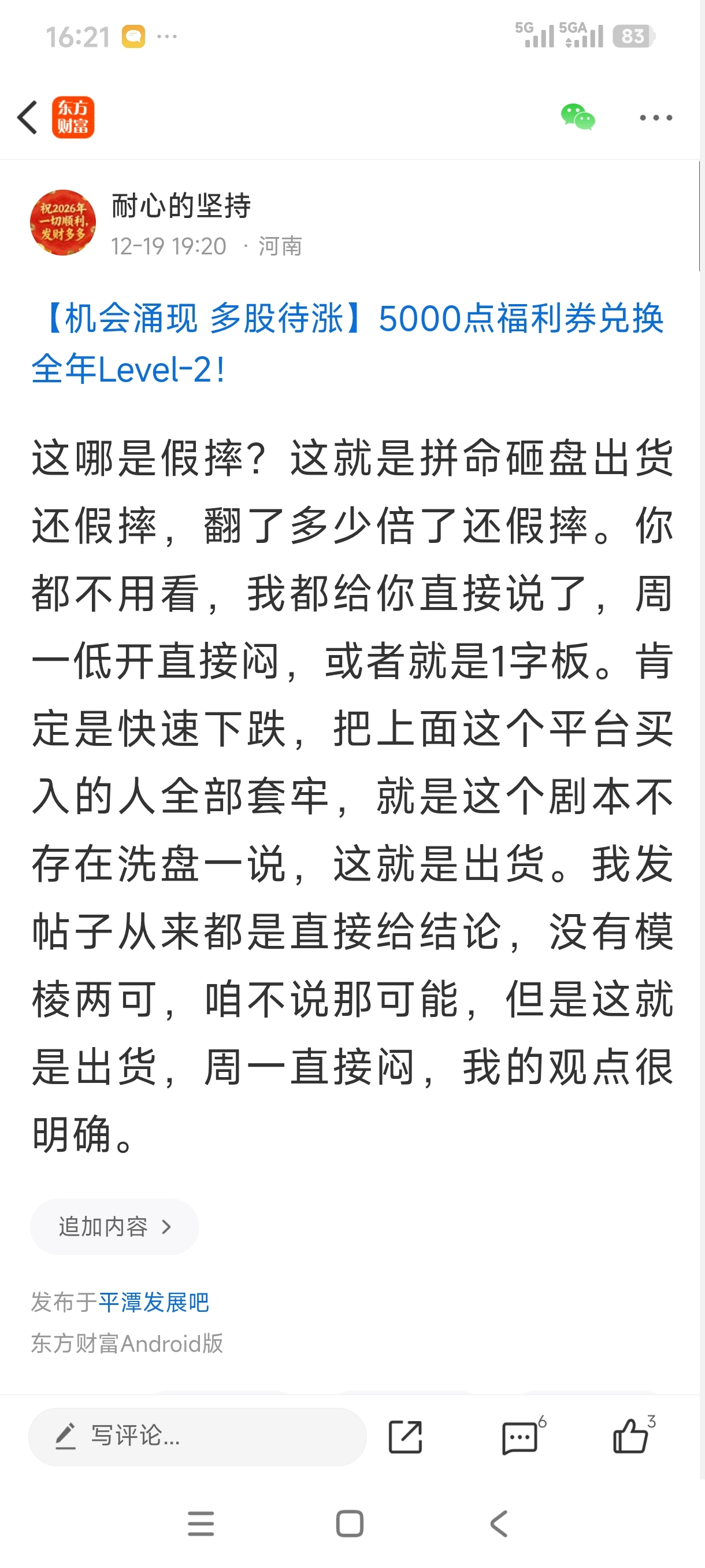 温馨提示: 1.根据《证券法》规定,禁止编造、传播虚假信息或者误导性信息,扰乱证券市场;2.用户在本社区发表的所有资料、言论等仅代表个人观点,与本网站立场无关,不对您构成任何投资建议。用户应基于自己的独立判断,自行决定证券投资并承担相应风险。《东方财富社区管理规定》
