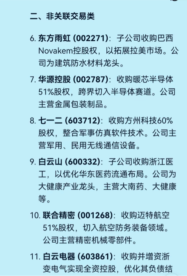 涉及非关联交易类的有:东方雨虹、华源控股、七一二、白云山、联合精密、白云电器。