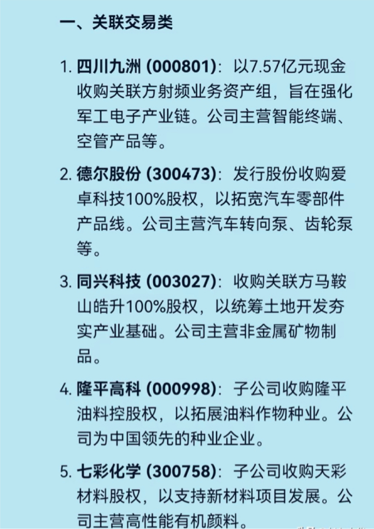 收购重组涉及关联交易的有:四川九州、德尔股份、同心科技、隆平高科、七彩化学。