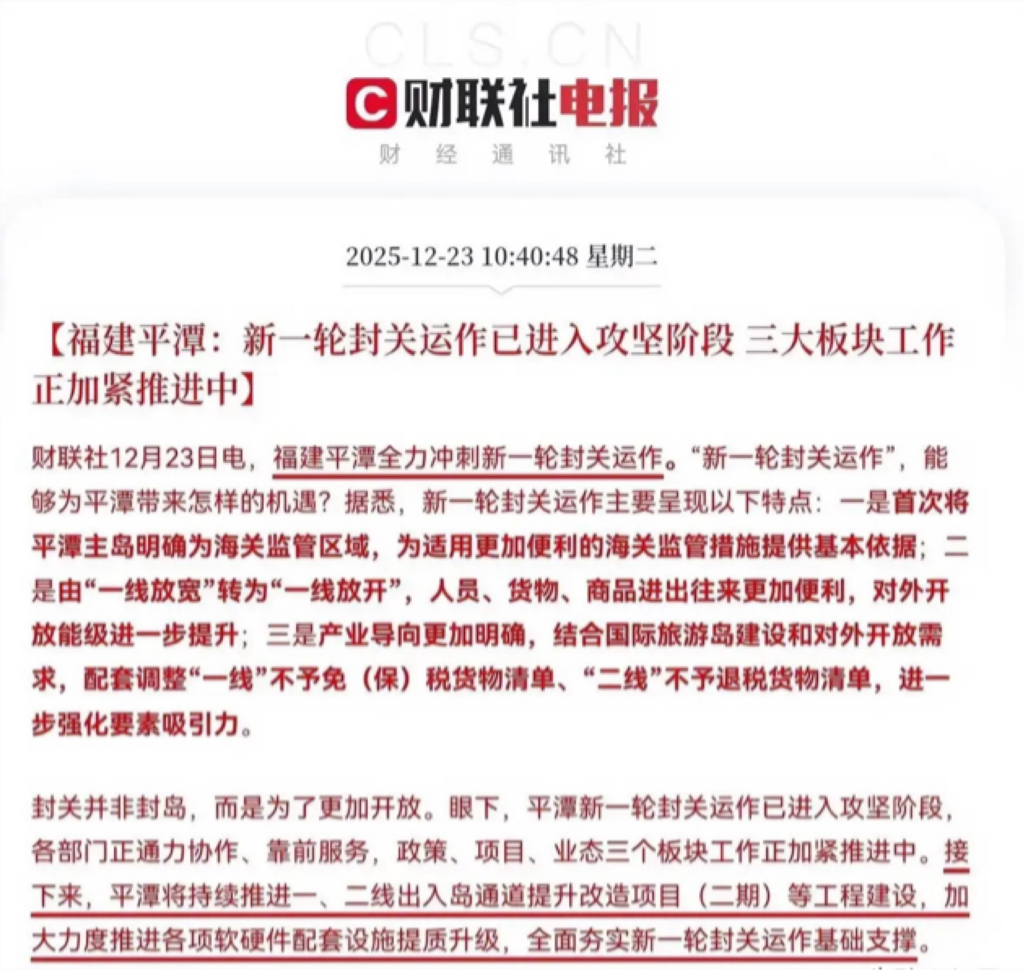 2025年12月23日财联社电报聚焦福建平潭新一轮封关运作,目前已进入攻坚阶段,封关核心是“更开放而非封岛”,呈现三大特点:平潭主岛明确为海关监管区、“一线放宽”转为“一线放开”提升开放能级、产业导向锚定国际旅游岛建设;当前正推进政策、项目、业态三大板块工作,还将加码出入岛通道基建与软硬件配套升级,利好福建本地基建、物流贸易、旅游、自贸区相关产业。