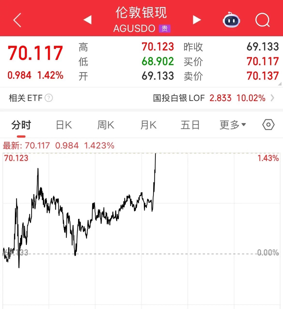 现货白银正式突破70美元/盎司,白天短暂停歇后,刚刚直接猛拉起来,再上一个台阶了