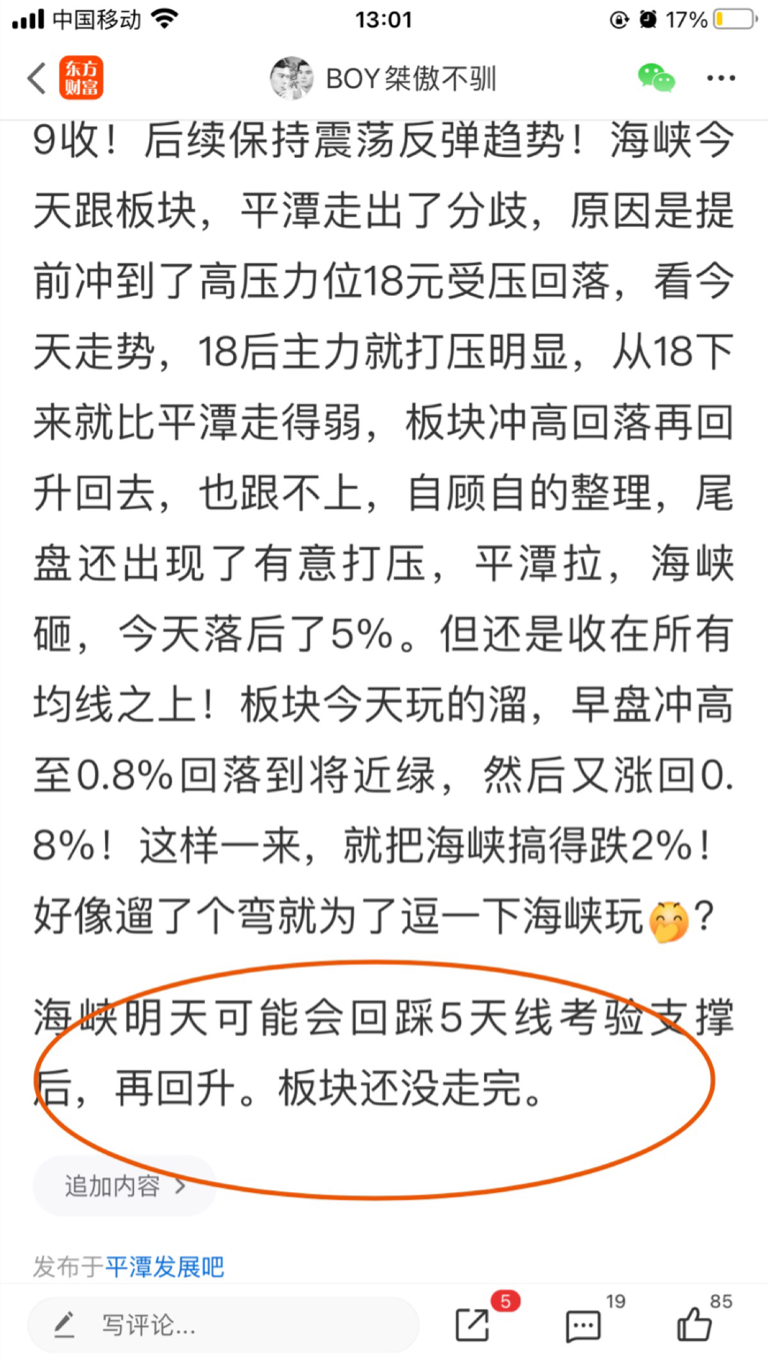 海峡昨天收盘就讲了今天会回踩5天线再回升,再加上早上我又重申了一遍洗盘。5跟10天线不破,不轻易看空。海峡就是18站不稳,主力往下打压下化解上方的压力!两只股假摔下,整体重心是往上移的,试想下,真出货,早打趴下了,还会海峡前天给你18块?平潭给你将近14的价跑?都是一些没脑子的才会被吓掉!你看平潭每砸一次货都被捡走