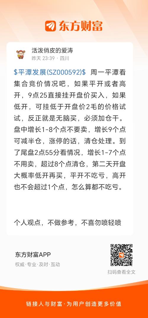 $平潭发展(SZ000592)$ 周一平潭看集合竞价情况吧,如果平开或者高开,9点25直接挂开盘价买入,如果低开,可挂低于开盘价2毛的价格试试,反正就是无脑买,必须加仓干。盘中增长1-8个点不要卖,增长9个点可减半仓,涨停的话,清仓处理。到了尾盘2点55分看情况,增长1-7个点不用卖,超过8个点清仓,第二天开盘大概率低开再买,平开不吃亏,高开也不会超过1个点,怎么算都不吃亏。