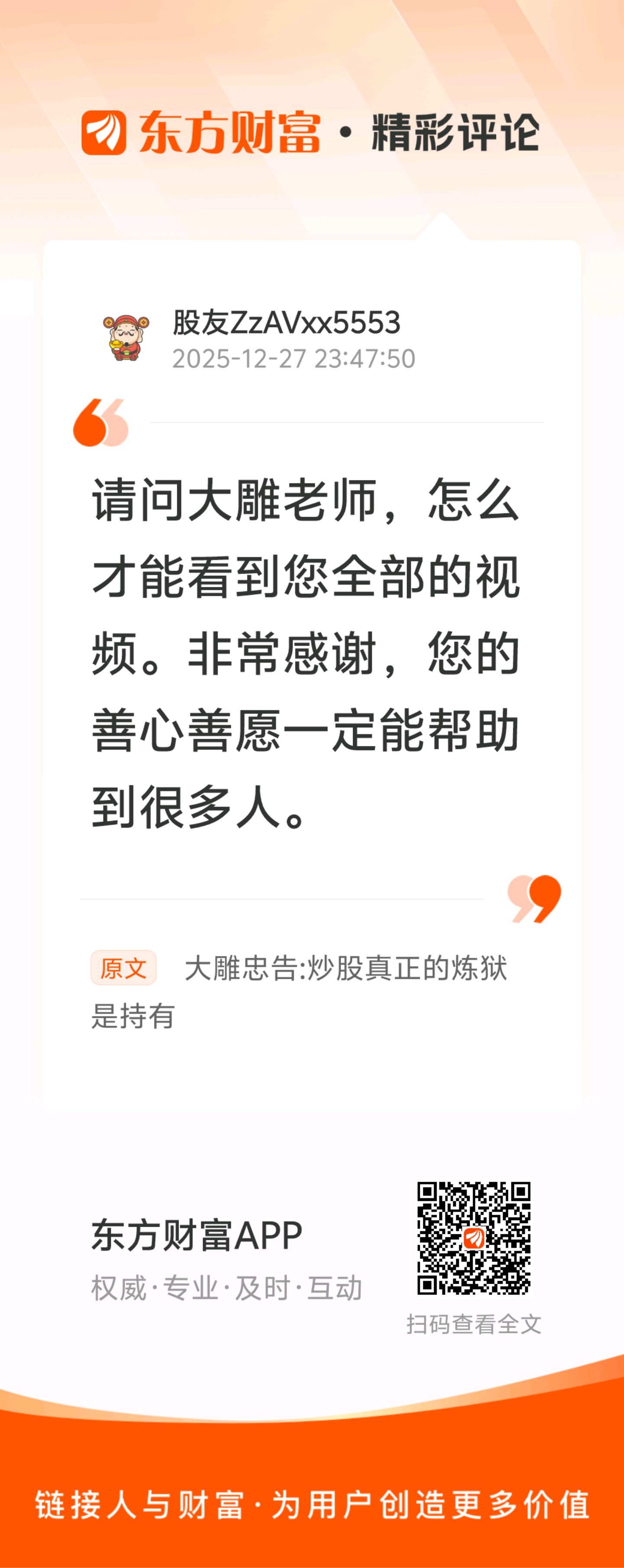 知行合一,大雕会让你知道。没事可以看看我的视频,看看我的文章,希望能对所有股友有