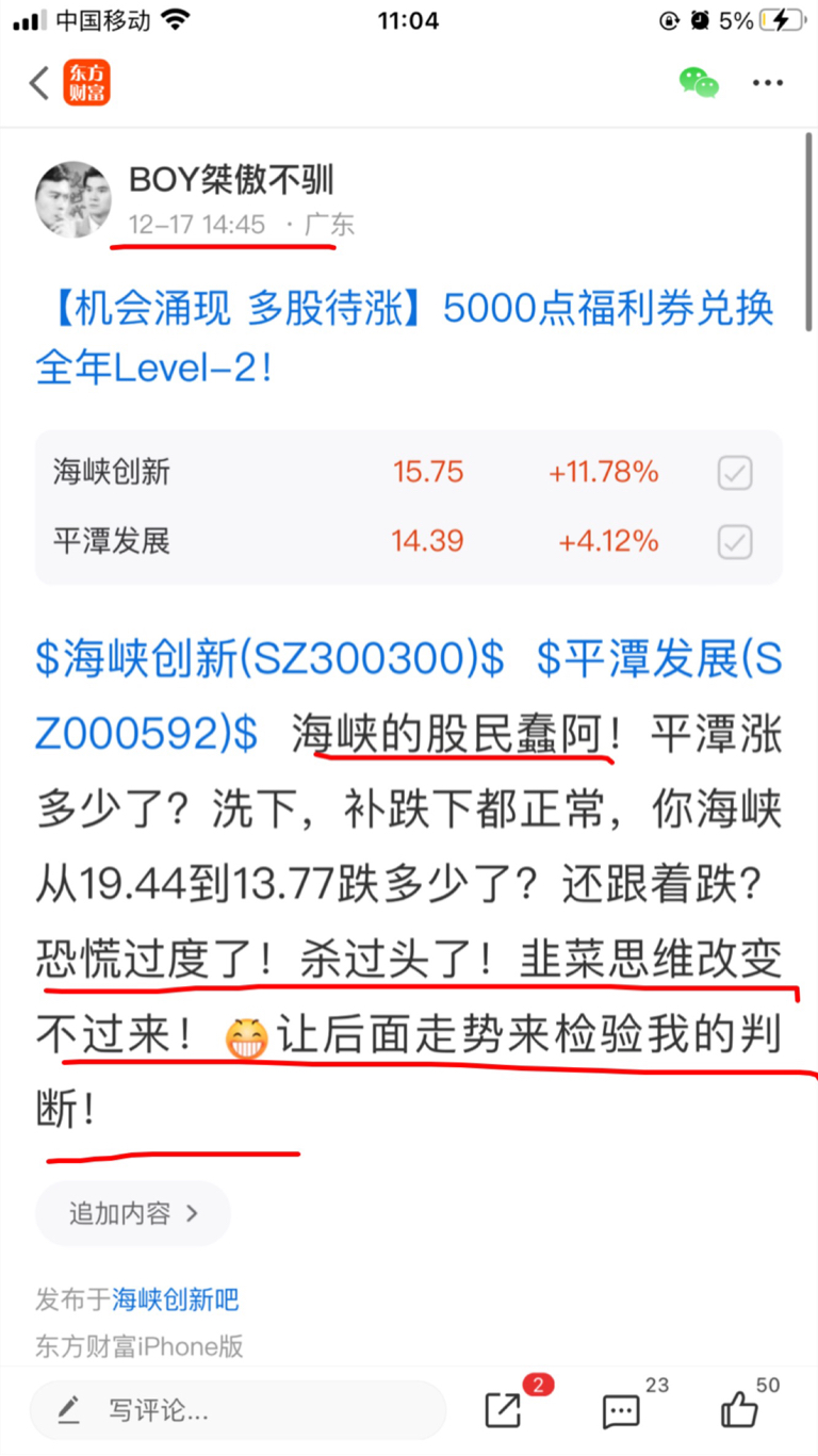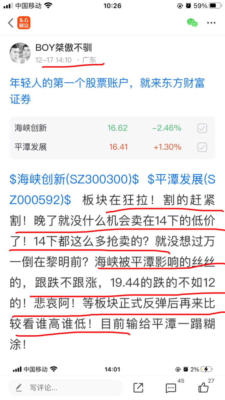 $平潭发展(SZ000592)$ $海峡创新(SZ300300)$ 平潭连涨5天后的小幅洗盘,海峡又把上次12月17号的走势重写了一次,又是从超过平潭4块钱到落后平潭,上次是在双双回调到14元下的时候,后面反弹超过5块钱。又走了一次一模一样的。海峡又是散户恐慌了,加上元旦放假因素,一回调就鸡飞狗跳!