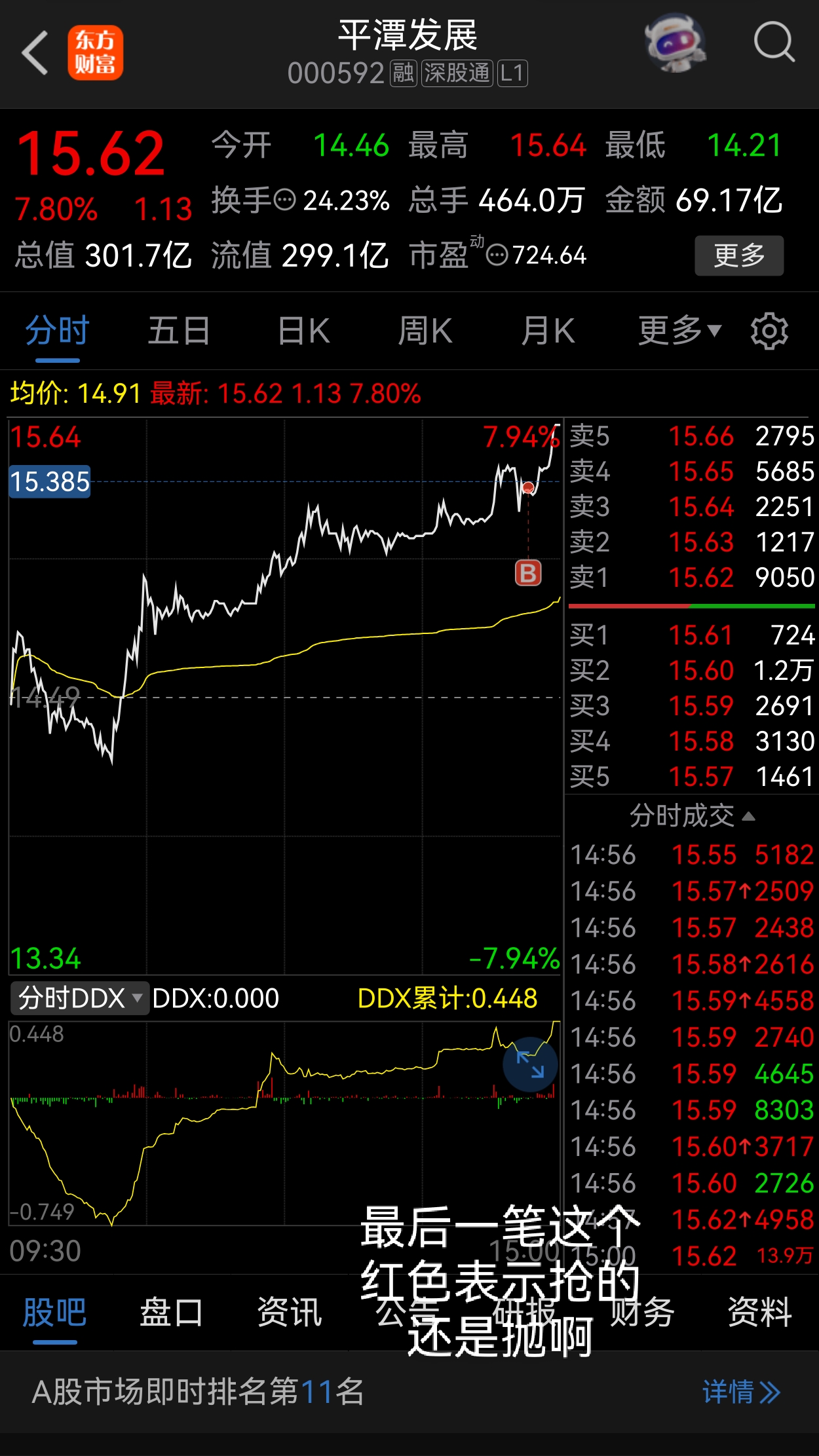 $平潭发展(SZ000592)$ 兄弟们请教一下,尾盘竞价最后一笔红色的13.9,表示抛还是抢啊?