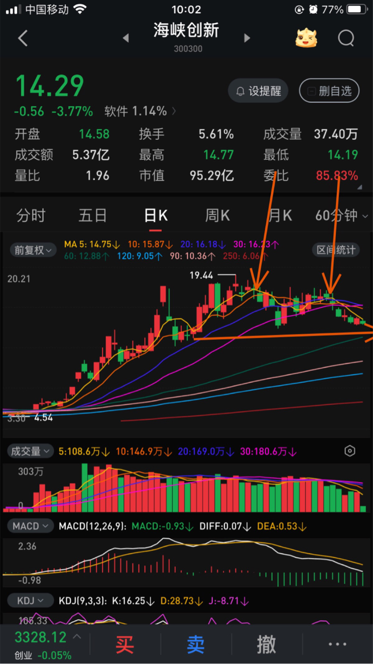 我箭头两个位置,都是均线压力位。上一回就是如此,砸下来后,后面会再回升上去。所以走得不管不顾。