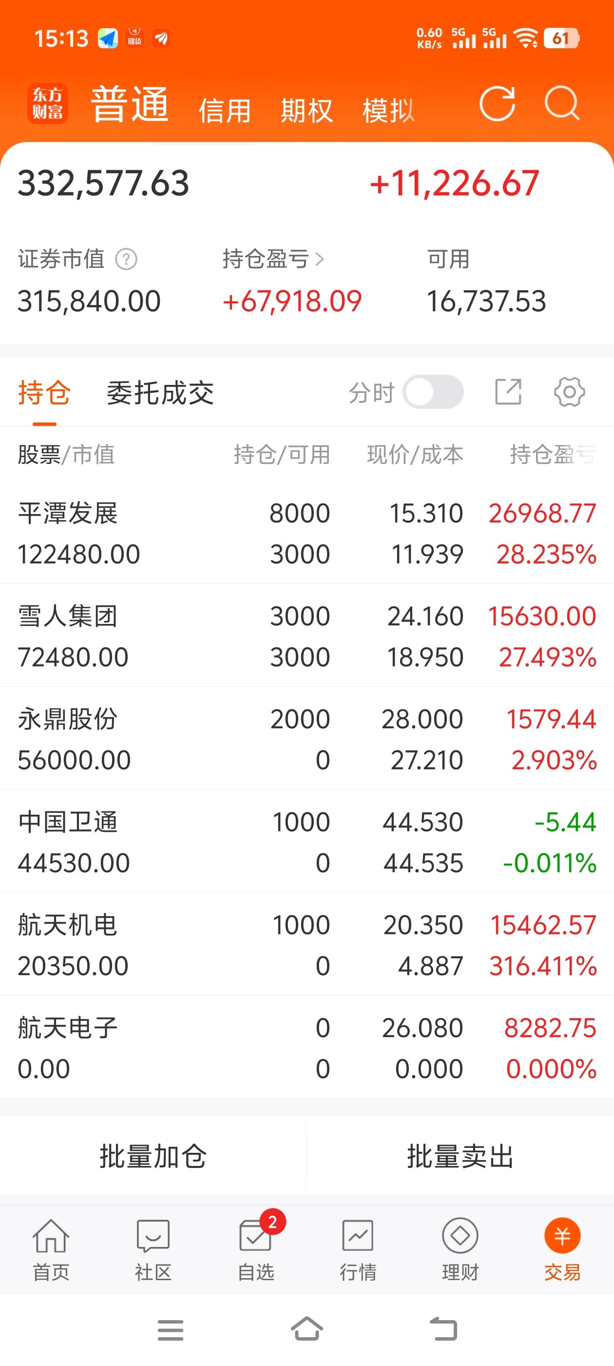 $平潭发展(SZ000592)$ $永鼎股份(SH600105)$ $雪人集团(SZ002639)$ 今天航天想做个T结果卖飞了干脆清仓了,加仓平潭吃了面,上车永鼎和卫通,希望明天别吃面,红一点就行,加油