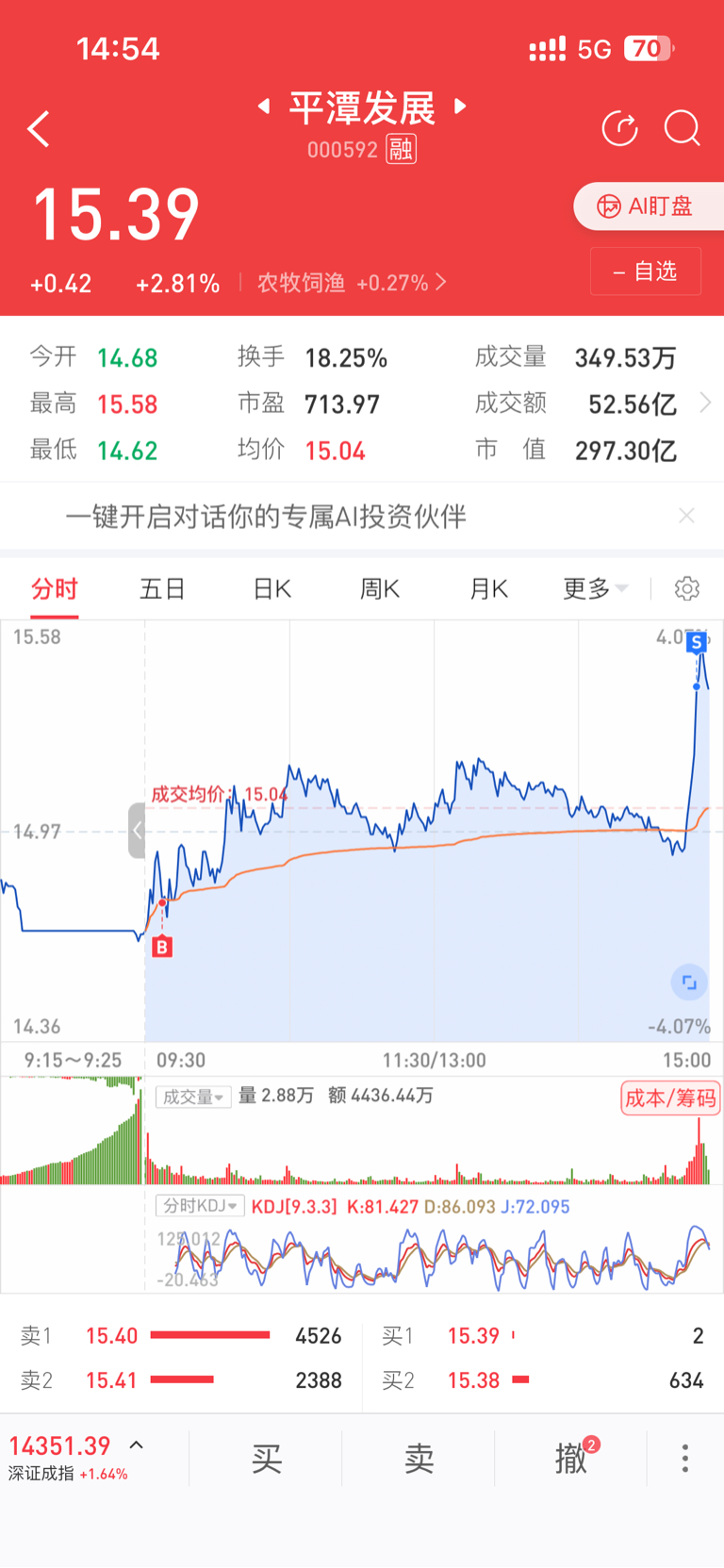 $平潭发展(SZ000592)$ 等一天了,本来已经放弃了,今天做不了t就当加仓吧,没想到卖出去了,虽然挂单了15.3,但是做了五毛钱也很满足了