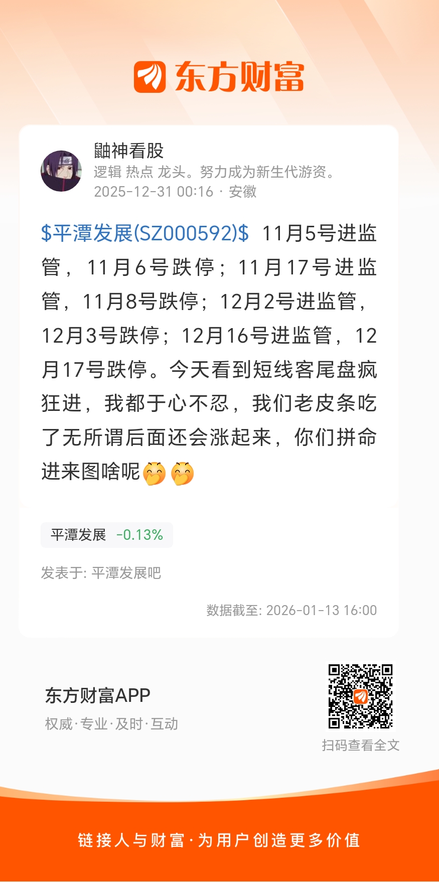 $平潭发展(SZ000592)$ 11月5号进监管,11月6号跌停;11月17号进监管,11月8号跌停;12月2号进监管,12月3号跌停;12月16号进监管,12月17号跌停。今天看到短线客尾盘疯狂进,我都于心不忍,我们老皮条吃了无所谓后面还会涨起来,你们拼命进来图啥呢