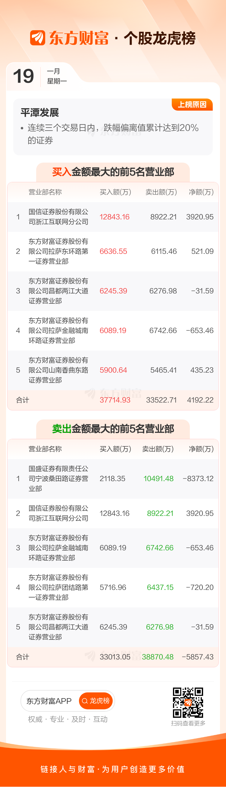 交易所2026年1月19日公布的交易公开信息显示,平潭发展因成为连续三个交易日内,跌幅偏离值累计达到20%的证券上榜。平潭发展当日收报11.29元,涨跌幅-9.97%,换手率1.62%,成交额3.50亿。异常期间1月15日至1月19日,期间涨幅-27.07%,累计偏离值-27.32%,区间成交额68.69亿。