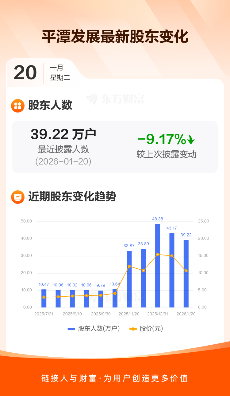 平潭发展:截至1月20日最新股东户数39.22万户,较上期减少9.17%