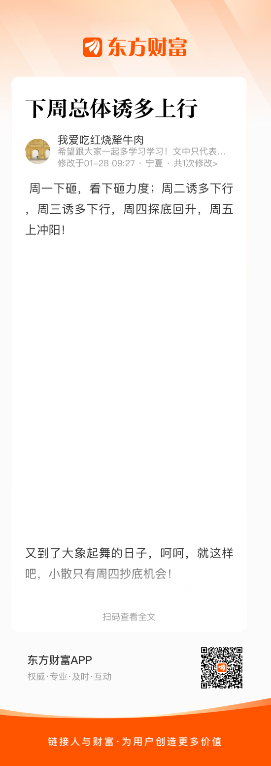 周一下砸,看下砸力度;周二诱多下行,周三诱多下行,周四探底回升,周五上冲阳!