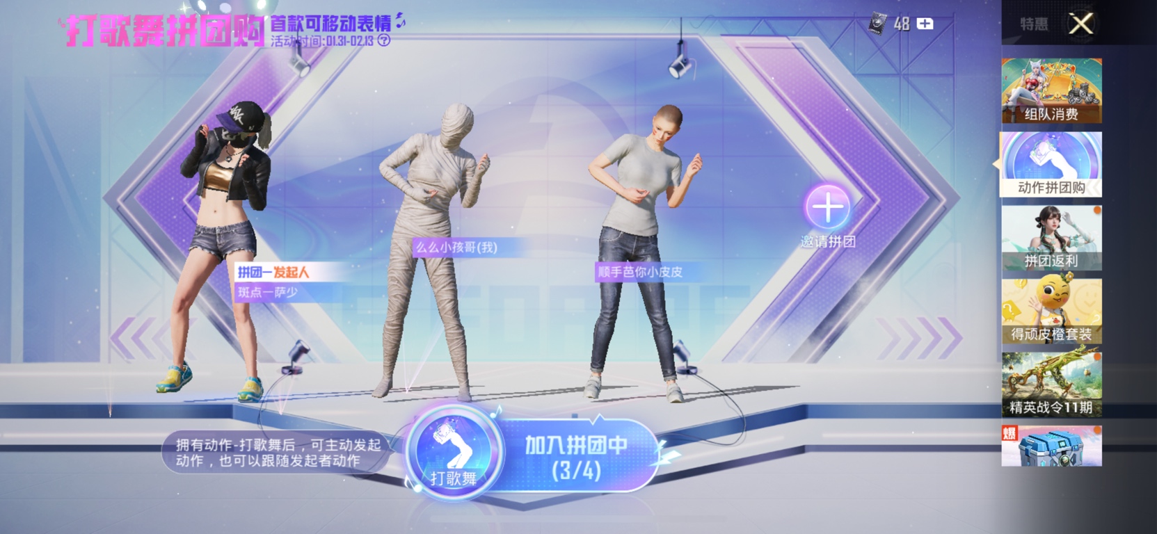 千元妹纸来溜达了。吃鸡打歌舞3缺一拼团。过年来个气氛