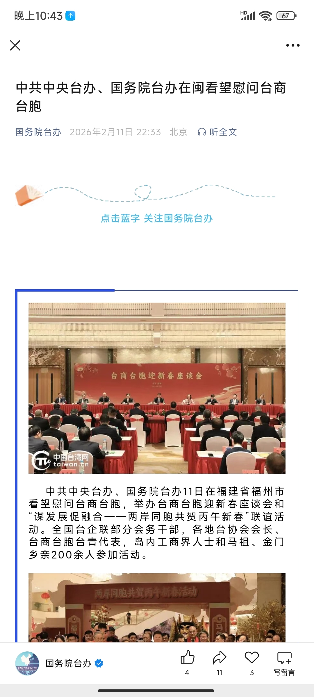 $平潭发展(SZ000592)$ 重磅:国台办刚发的新闻:中共中央台办、国务院台办11日在福建省福州市看望慰问台商台胞,举办台商台胞迎新春座谈会和“谋发展促融合——两岸同胞共贺丙午新春”联谊活动。全国台企联部分会务干部,各地台协会会长、台商台胞台青代表,岛内工商界人士和马祖、金门乡亲200余人参加活动。