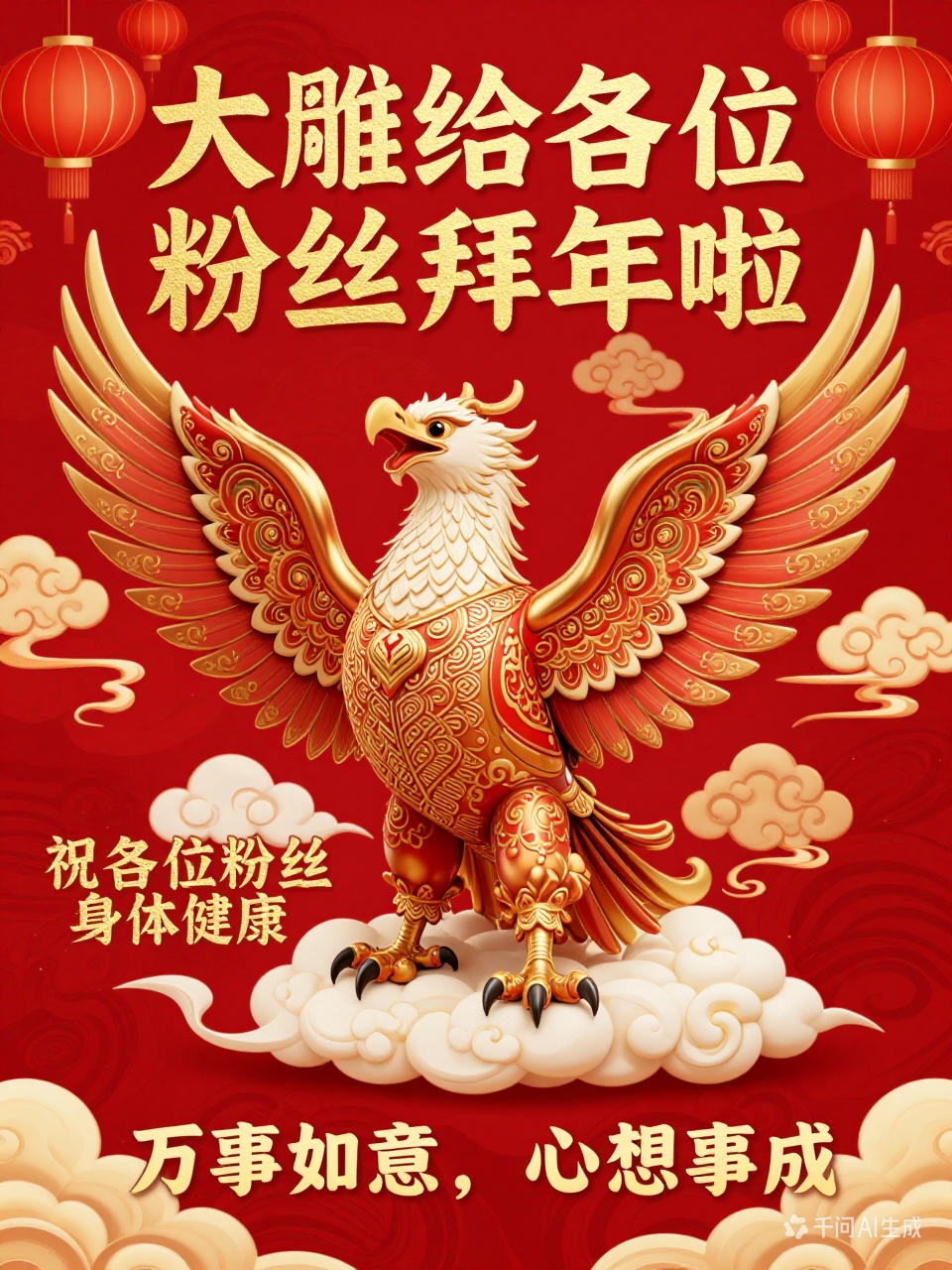 祝所有财友新年快乐,大雕给你们拜年啦,祝你们身体健康,万事如意,心想事成