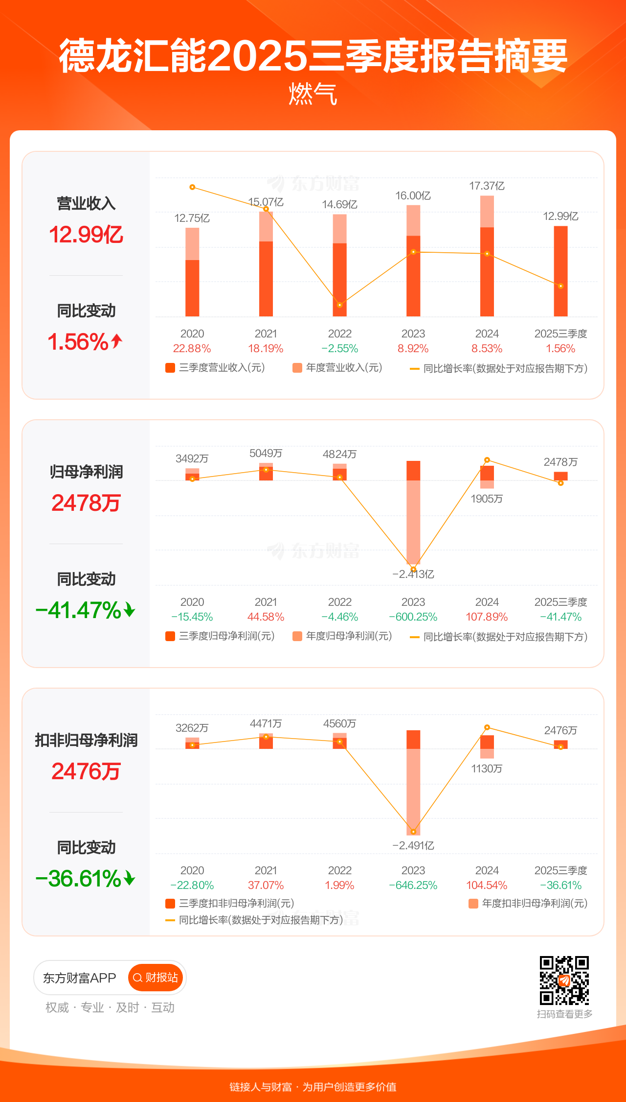 德龙汇能10月31日发布2025年三季报显示,公司前三季实现营业收入12.99亿元,同比增长1.56%;归母净利润2477.76万元,同比下滑41.47%;扣非归母净利润2476.13万元,同比下滑36.61%。