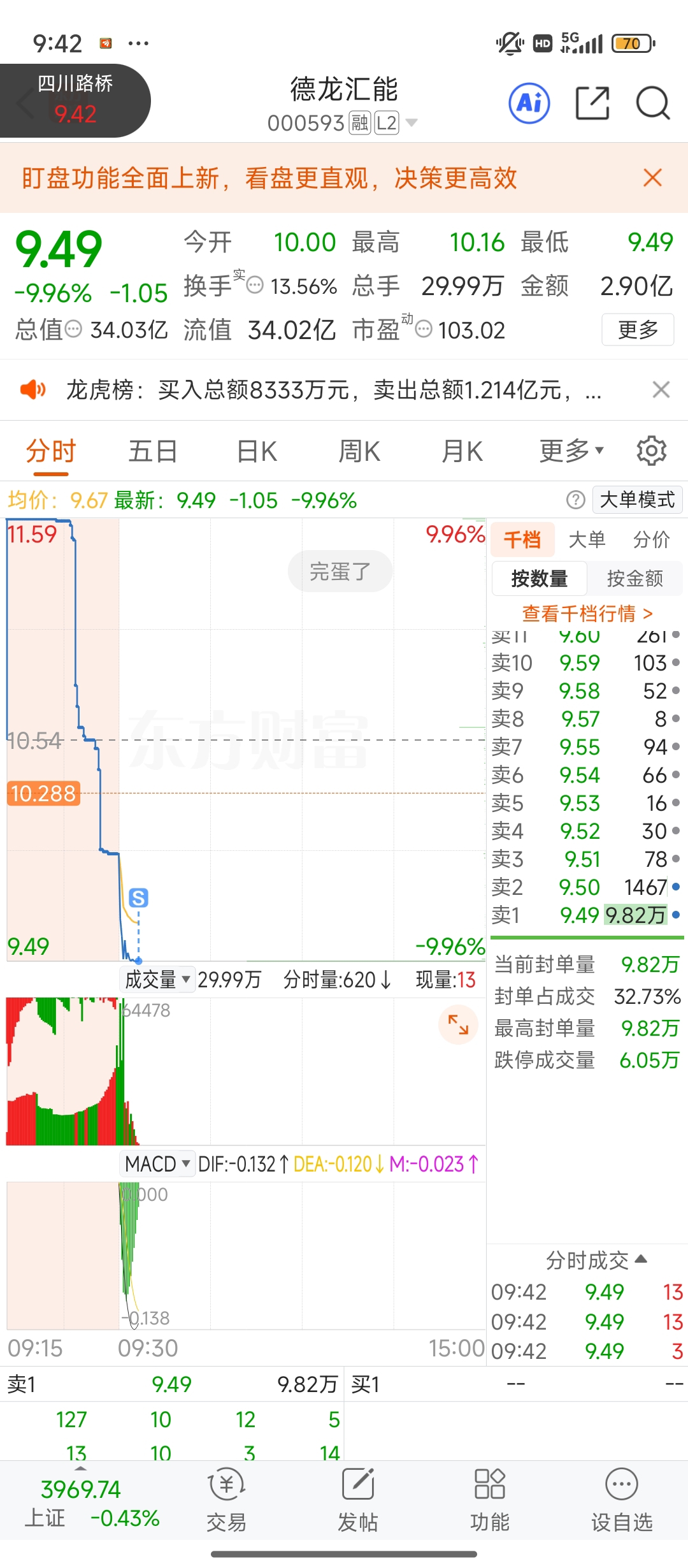 $德龙汇能(SZ000593)$ 留下的发财,昨天进的全部闷杀