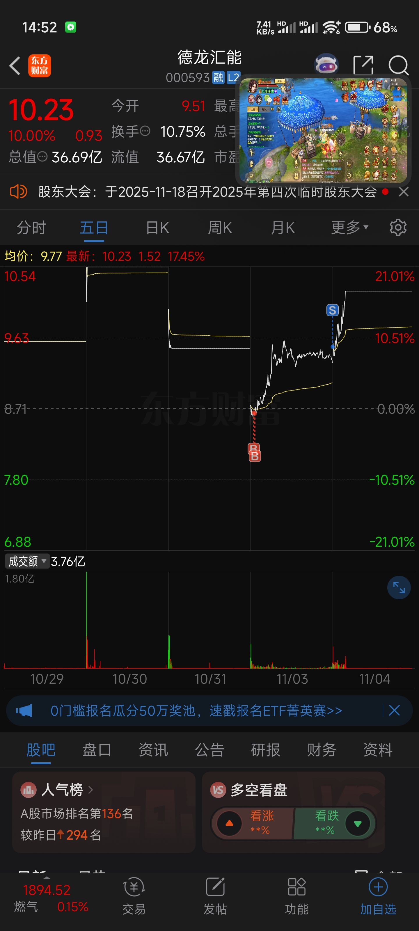 $德龙汇能(SZ000593)$ 昨天-8.96全仓买的今天一开盘有利润全仓卖了,少赚几个点