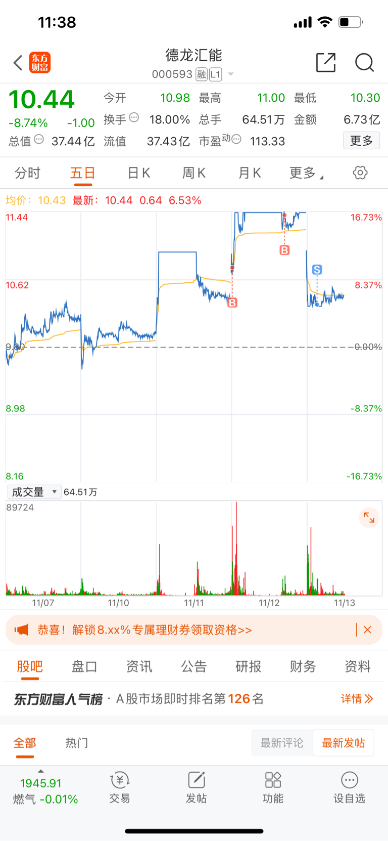 $德龙汇能(SZ000593)$ 卖了,想回来骂一句,害我损失十个点,可控范围内最少五个点。 奸诈狡猾的走势,不是普通你我可以掌握的。 我估摸着最近可能会趁控股权这个破事来回忽悠散户,大家谨慎,当然我买入是因为形态考虑的。 另外这个走势真像庄股,套住不知多久,另外据说新产业是什么面板子,总之是个不起眼的买卖。