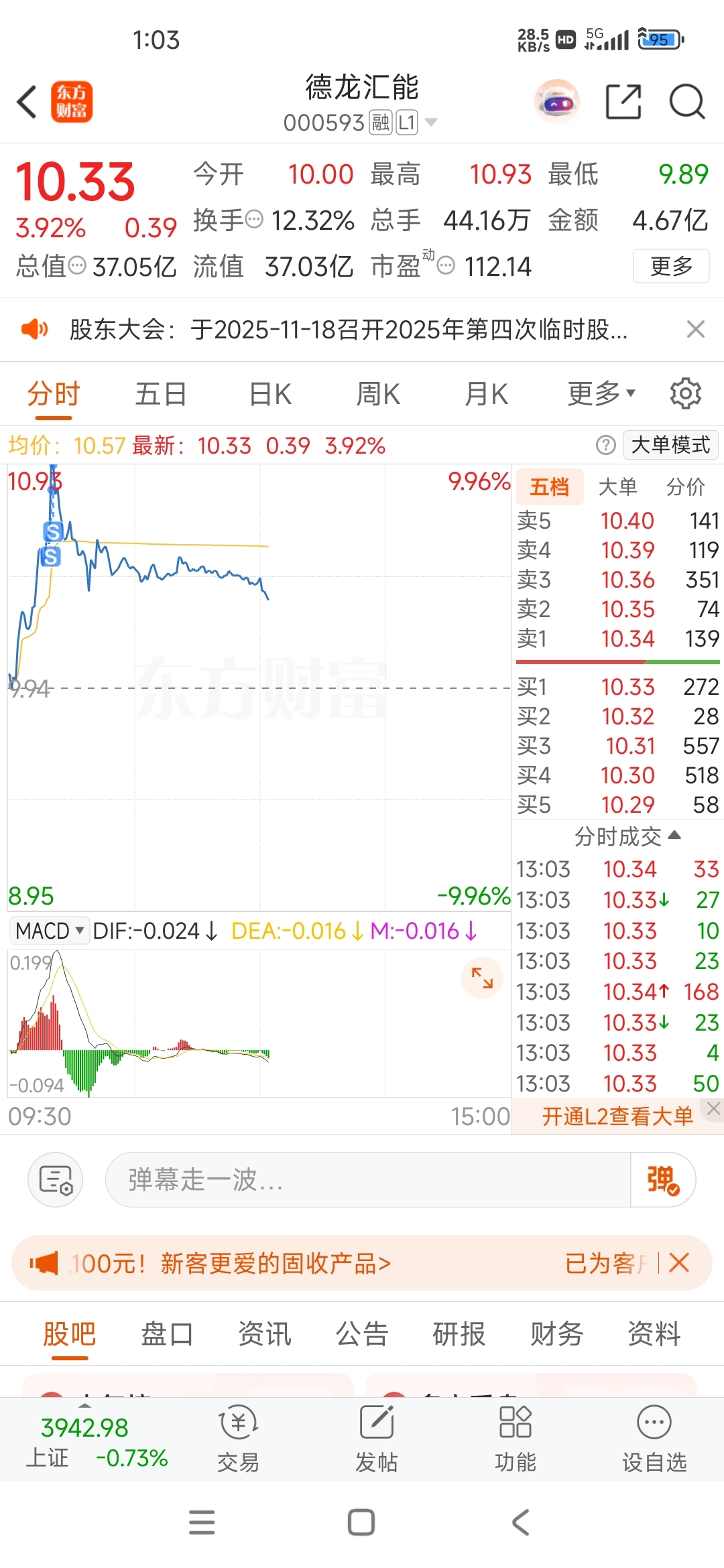$德龙汇能(SZ000593)$ 下午看情况