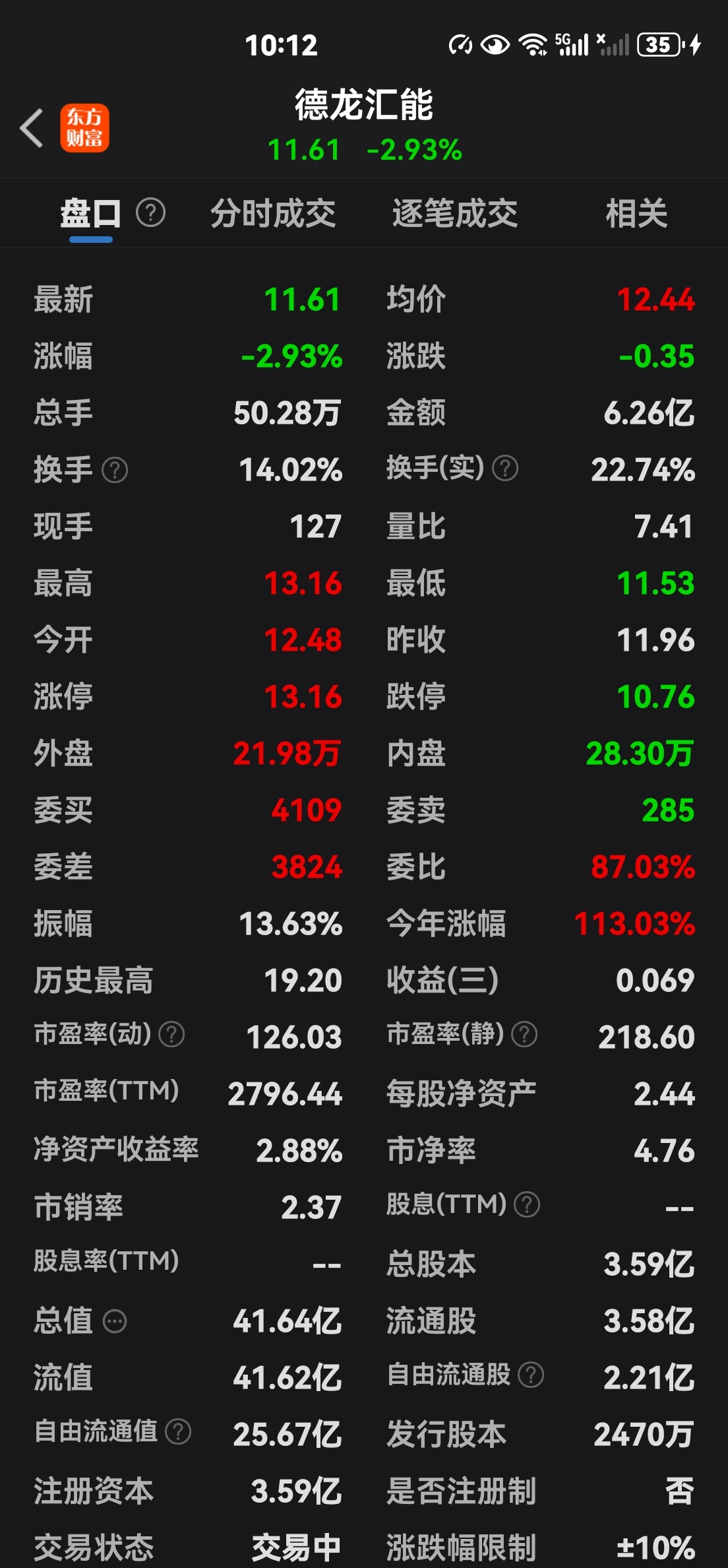 $德龙汇能(SZ000593)$ 【均价12.44元】现在11.66买进,感觉有短线机会,我买个8000股试水