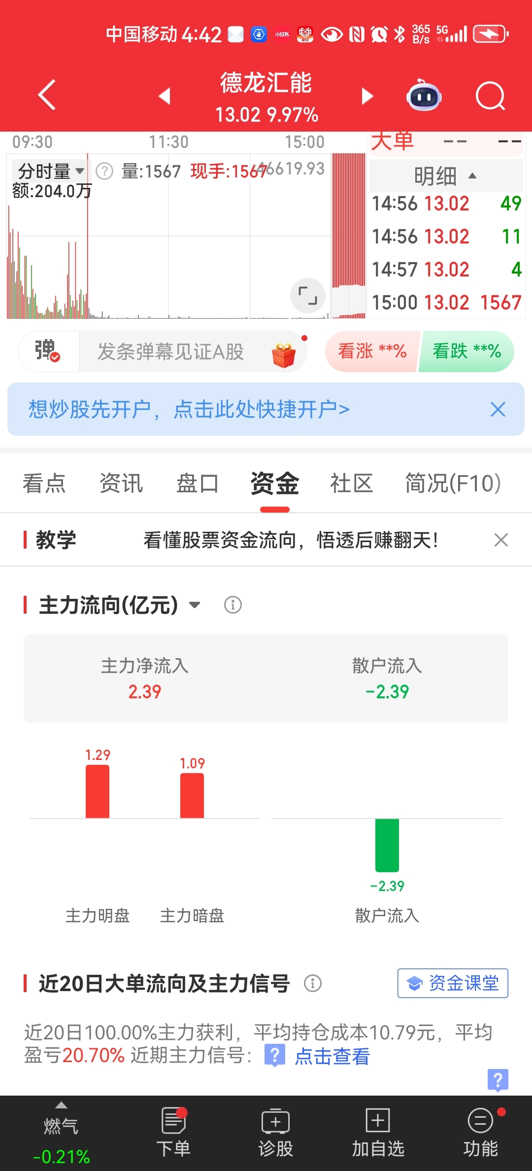 $德龙汇能(SZ000593)$ 明天没信心的朋友看过来,昨天承压测试+今天拉伸过程洗走了2.3亿散户。没上车的朋友也不要难过,国家政策还在,还能抓到挣钱的股票。