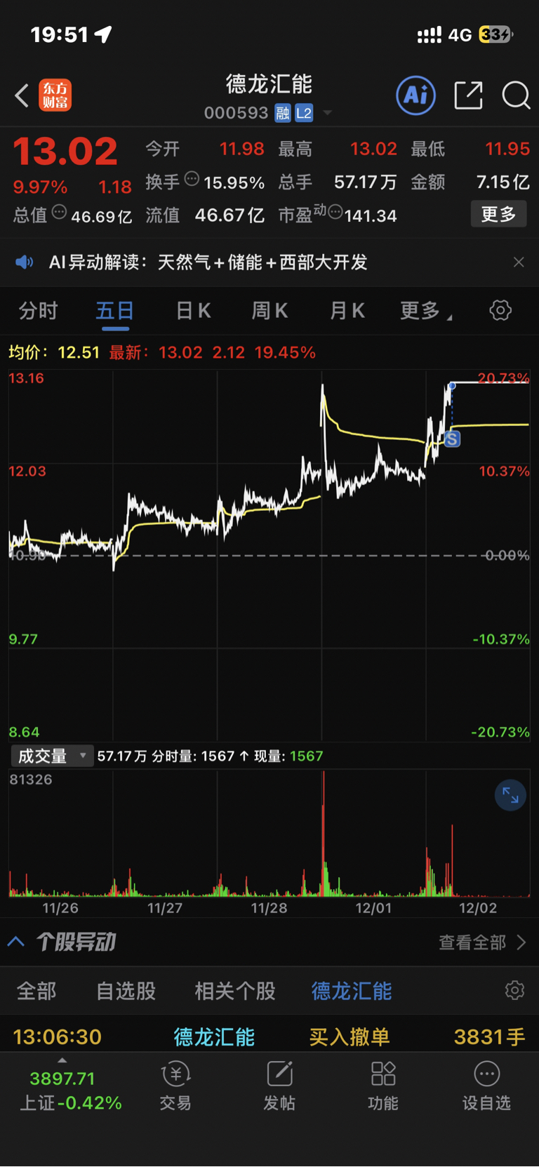$德龙汇能(SZ000593)$ 感觉卖飞了。