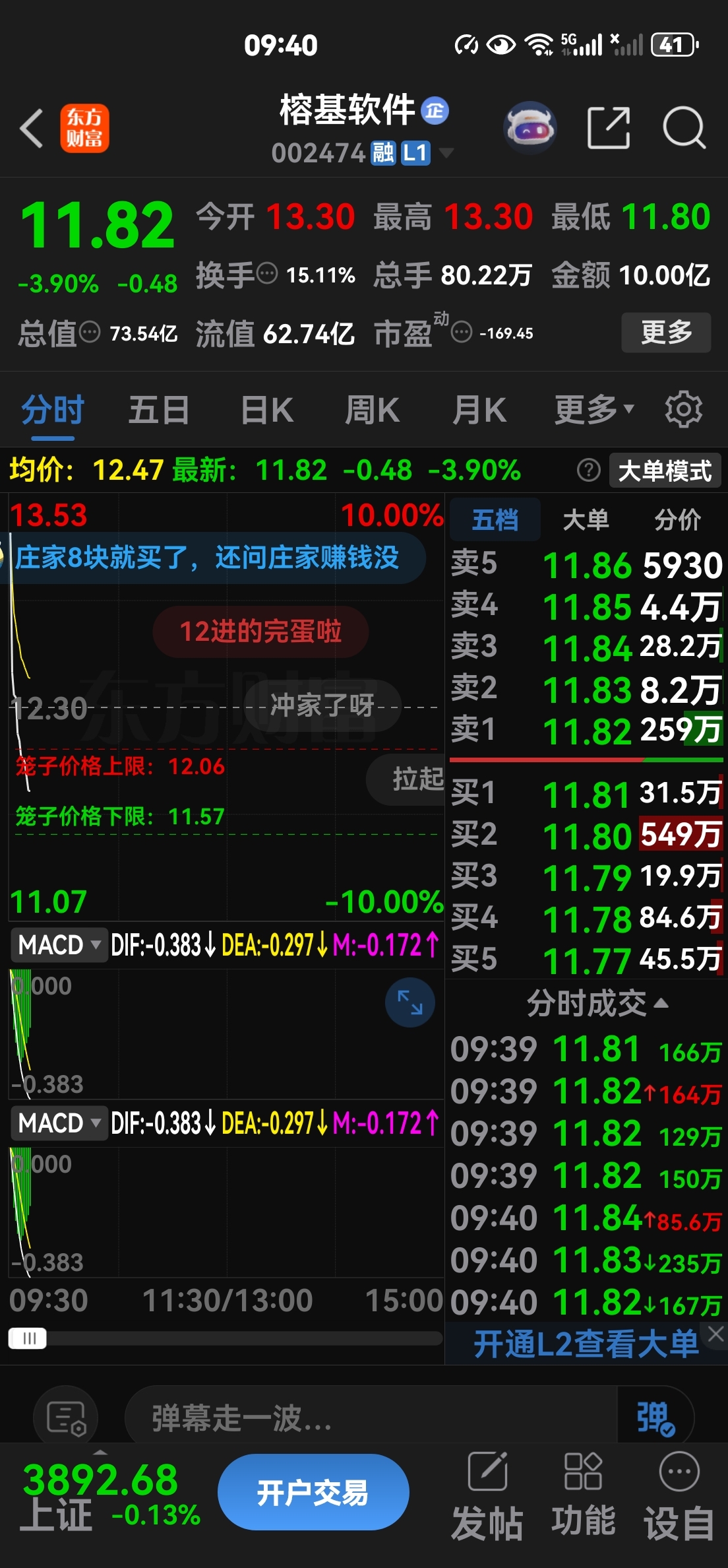 高位出德龙换【榕基软件】11.82买入,拒绝马后炮,实战王做现场,一天一个股票,