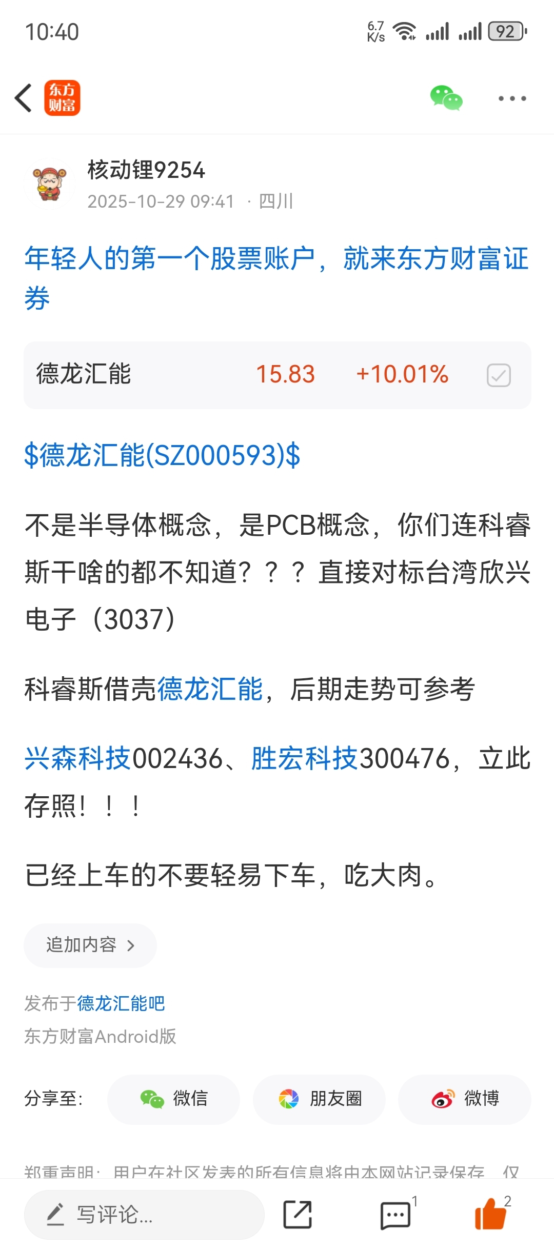 温馨提示: 1.根据《证券法》规定,禁止编造、传播虚假信息或者误导性信息,扰乱证券市场;2.用户在本社区发表的所有资料、言论等仅代表个人观点,与本网站立场无关,不对您构成任何投资建议。用户应基于自己的独立判断,自行决定证券投资并承担相应风险。《东方财富社区管理规定》