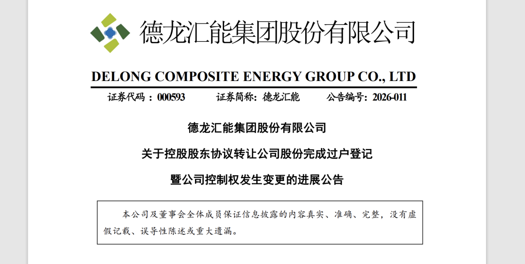 2月25日晚间,德龙汇能(000593.SZ)发布公告称,公司原控股股东北京顶信瑞通科技发展有限公司(以下简称“顶信瑞通”)协议转让公司股份事项完成过户。