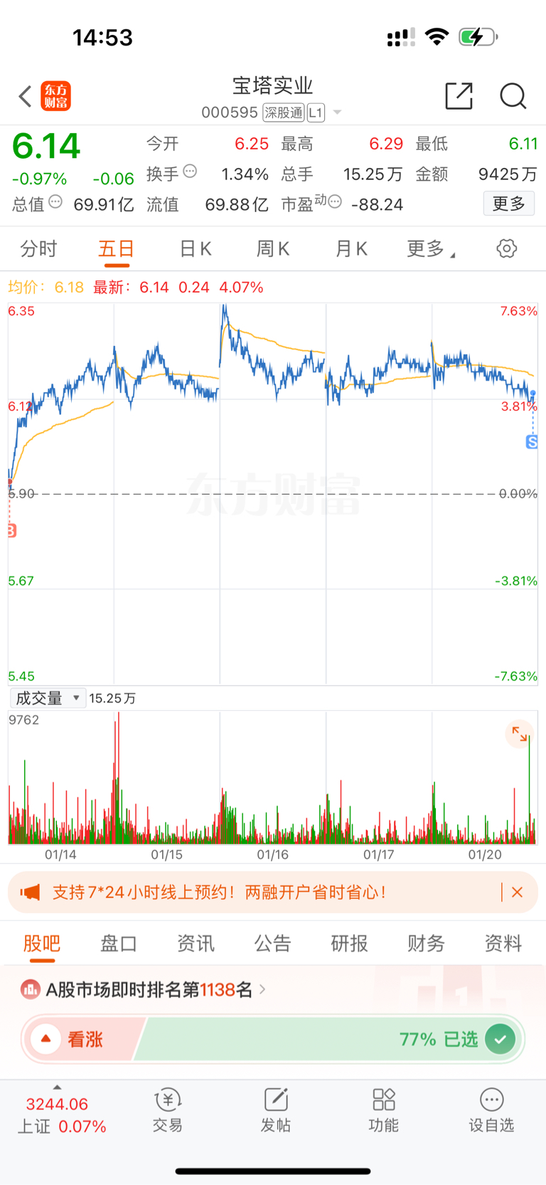 $宝塔实业(SZ000595)$ 撤了拿了一周没起色,赚不到4个点。明天一字涨停也认了!!!