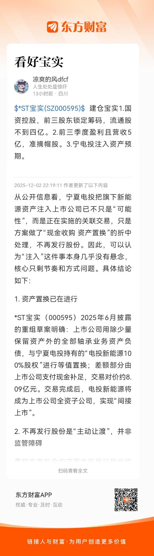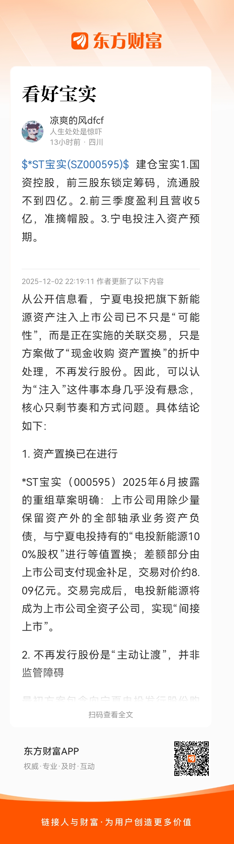 $*ST宝实(SZ000595)$ 建仓宝实1.国资控股,前三股东锁定筹码,流通股不到四亿。2.前三季度盈利且营收5亿,准摘帽股。3.宁电投注入资产预期。