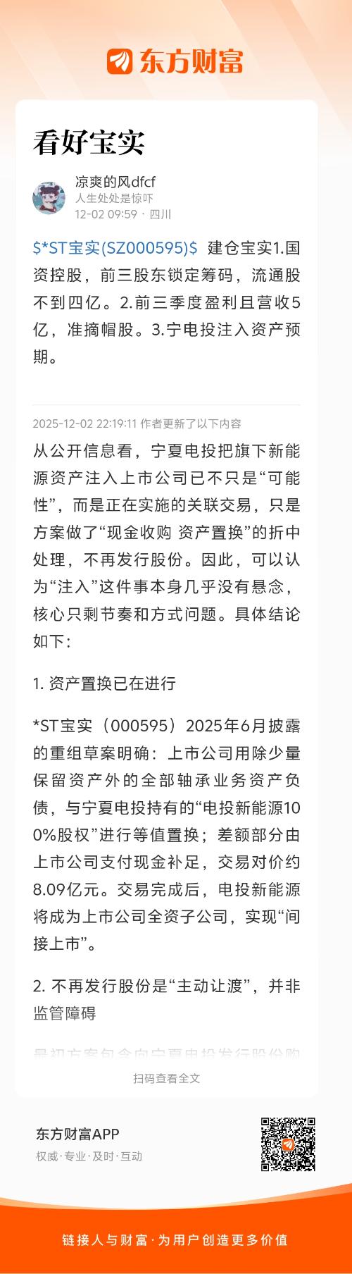 $*ST宝实(SZ000595)$ 建仓宝实1.国资控股,前三股东锁定筹码,流通股不到四亿。2.前三季度盈利且营收5亿,准摘帽股。3.宁电投注入资产预期。